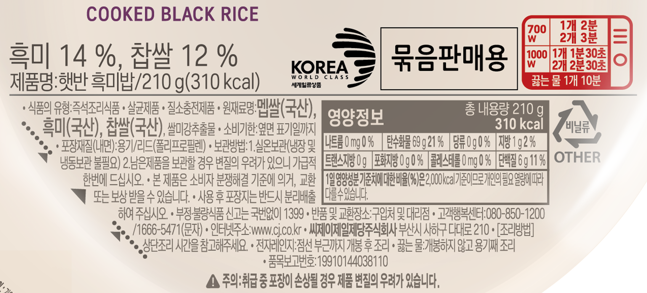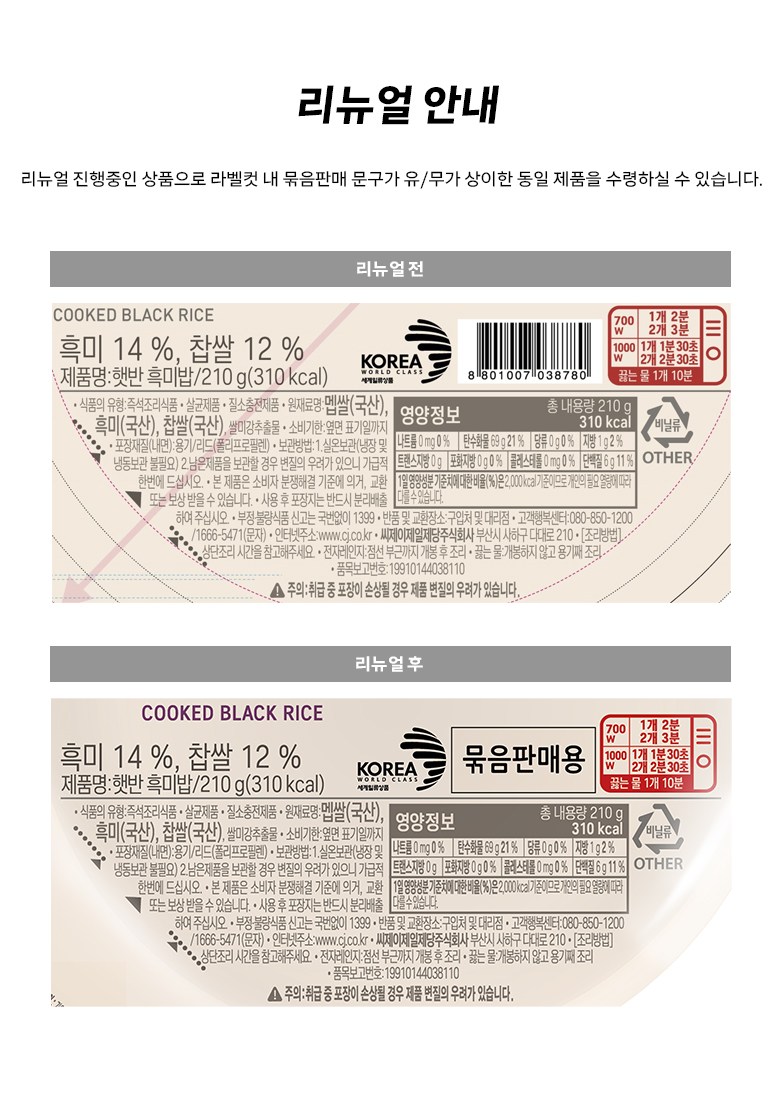 | 제품명 | 햇반 흑미밥 | 식품의 유형 | 컨텐츠 참조 |