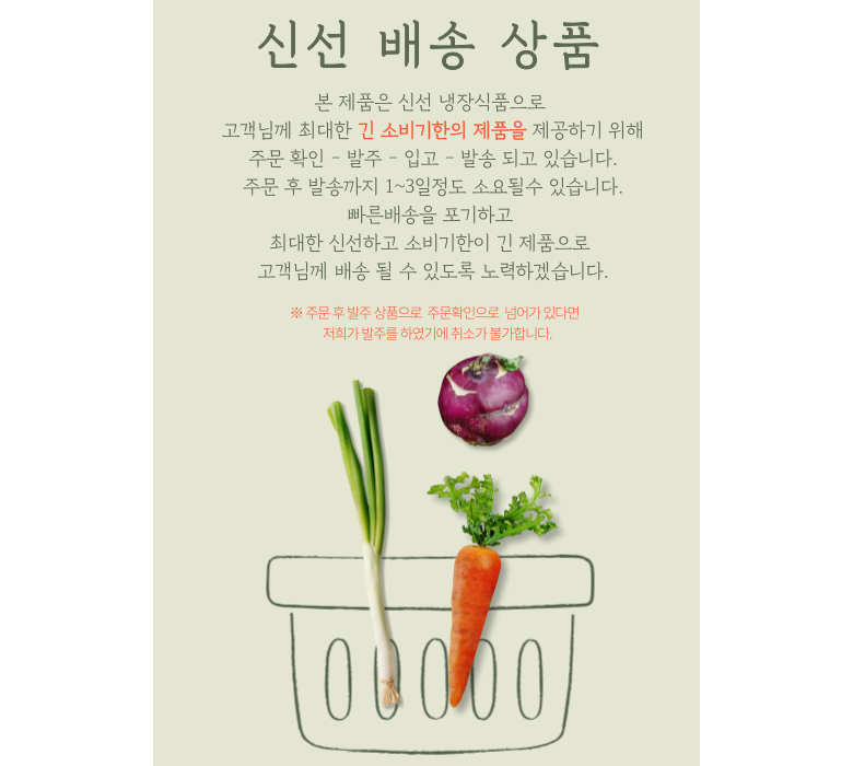 | 배송방법 | 신선/냉장/냉동 | 배송비 | 3,500원 · 도서산간 추가 배송비 - 제주 지역: 3,000원 - 도서산간 지역: 6,000원 |