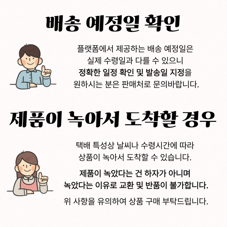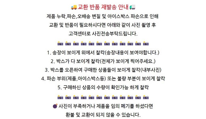 - ㆍ모니터 해상도의 차이로 인해 색상이나 이미지가 실제와 달라, 고객이 단순 변심으로 교환/반품을 무료로 요청하는 경우