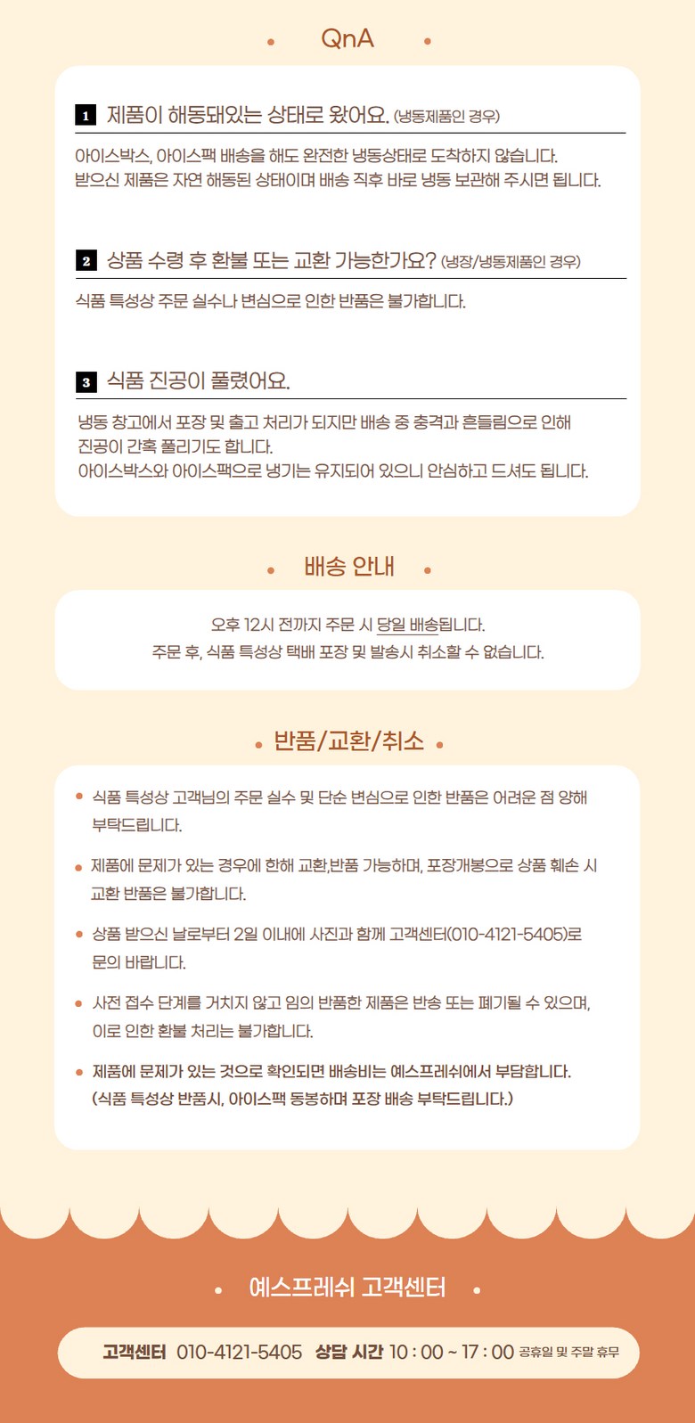 | 계절상품/식품/화장품 | ㆍ신선/냉장/냉동 상품의 단순변심의 경우 ㆍ뷰티 상품 이용 시 트러블(알러지, 붉은 반점, 가려움, 따가움)이 발생하는 경우, |