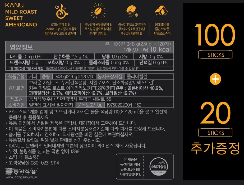 | 제품명 | 카누 마일드 로스트 스위트 아메리카노 | 식품의 유형 | 컨텐츠 참조 |
