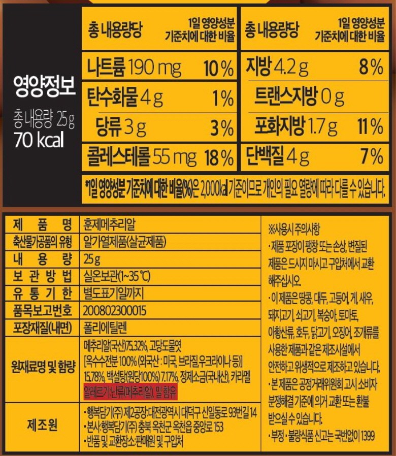| 제품명 | 훈제 메추리알 | 식품의 유형 | 컨텐츠참조 |