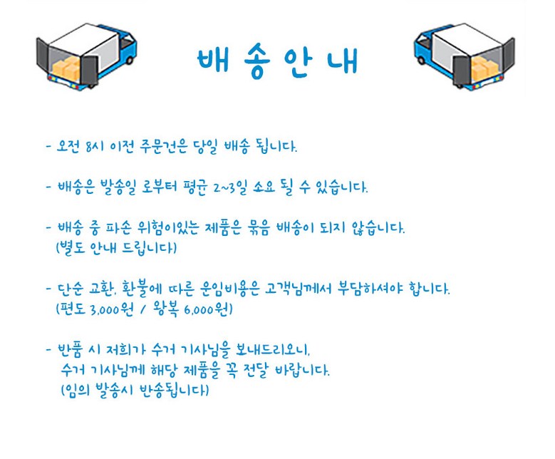 | 교환/반품 비용 (왕복비용) | 8,000원 - 단, 고객 변심의 경우에만 발생 - 도서산간 지역 배송불가 |