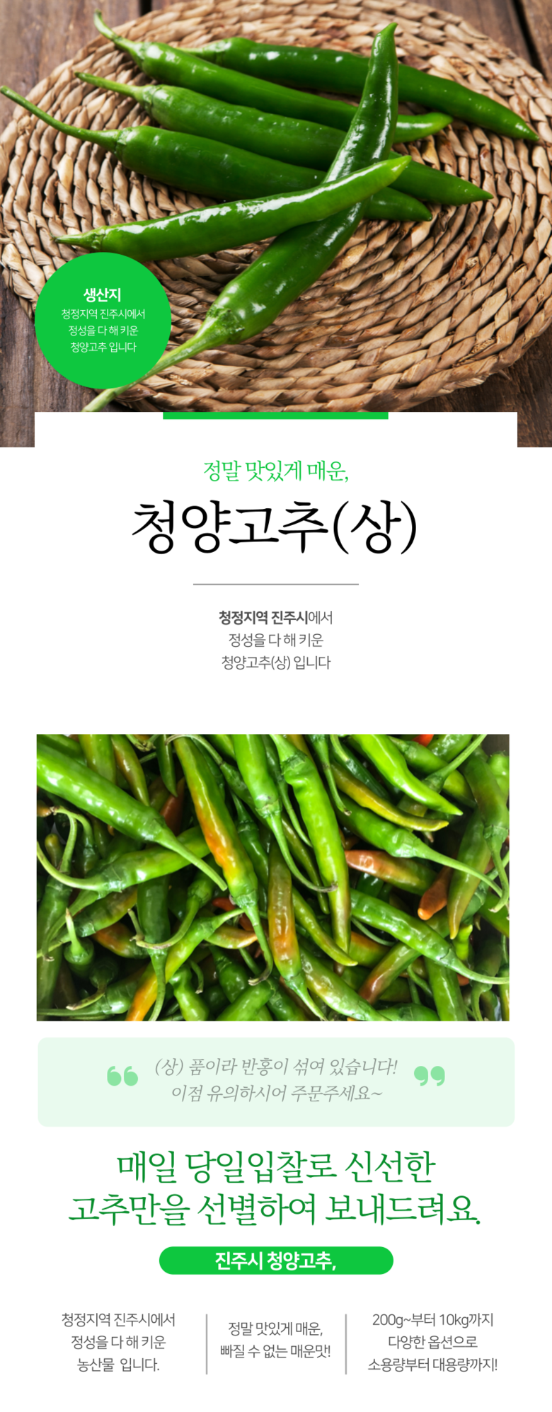 | 품목 또는 명칭 | 청양고추(상) | 포장단위별 내용물의 용량(중량),수량,크기 | 1kg - 1박스 |