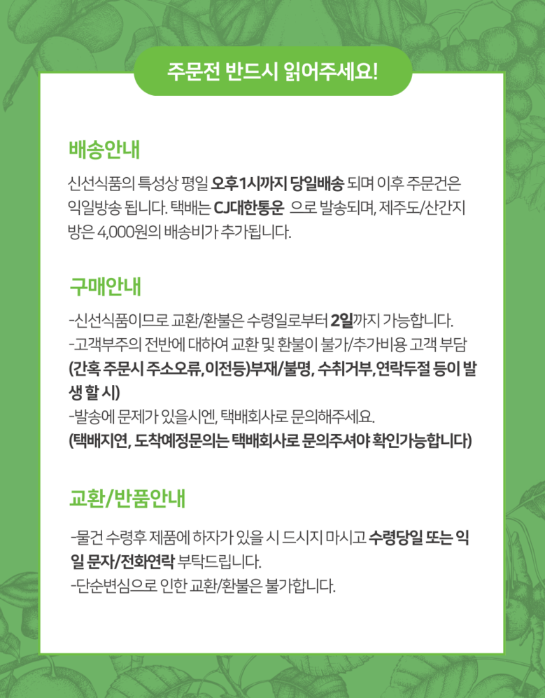 | 배송방법 | 신선/냉장/냉동 | 배송비 | 무료배송 · 도서산간 추가 배송비 - 제주 지역: 4,000원 - 도서산간 지역: 4,000원 |
