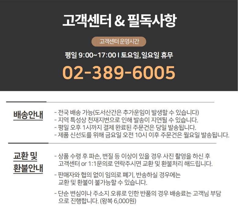 - ㆍ모니터 해상도의 차이로 인해 색상이나 이미지가 실제와 달라, 고객이 단순 변심으로 교환/반품을 무료로 요청하는 경우