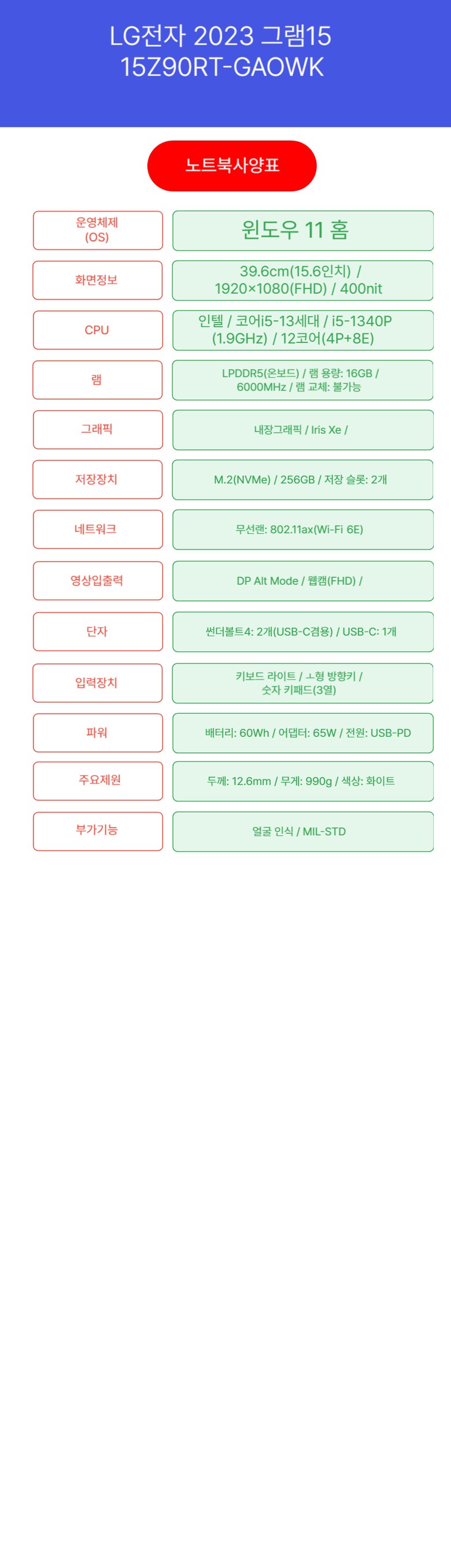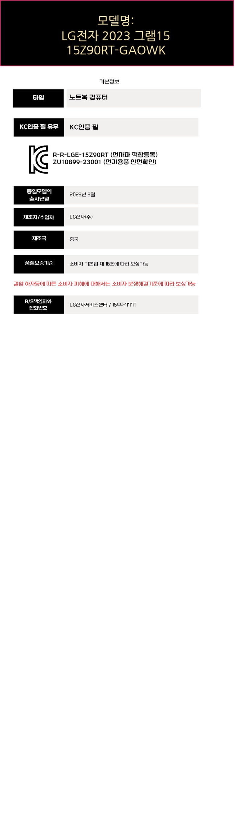| 품명 및 모델명 | LG전자 2023 그램 15, 15Z90RT | KC 인증정보 | R-R-LGE-15Z90RT, ZU10899-23001 |