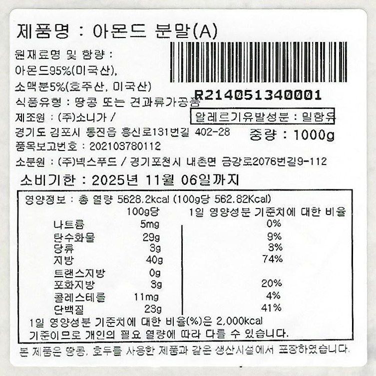 | 포장단위별 내용물의 용량(중량), 수량 | 1kg x 1개 | 원재료명 및 함량 | 컨텐츠 참조 |