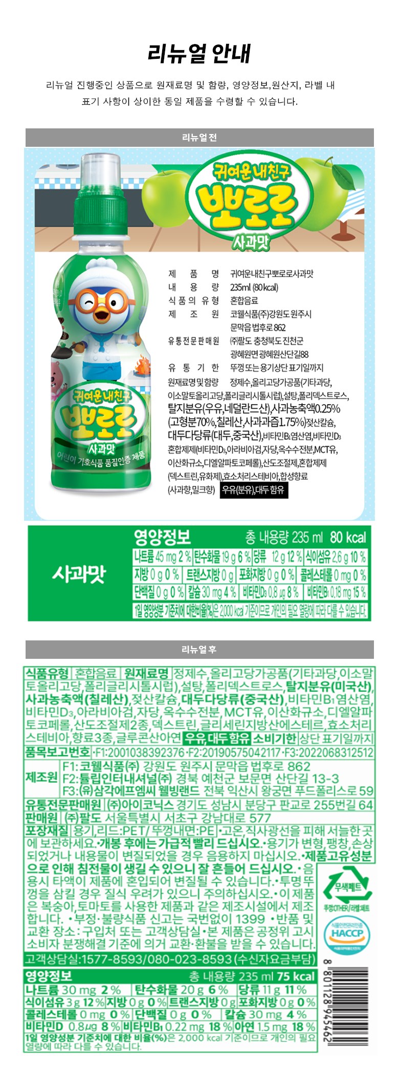 | 제품명 | 뽀로로 음료 사과맛 | 식품의 유형 | 혼합음료 |