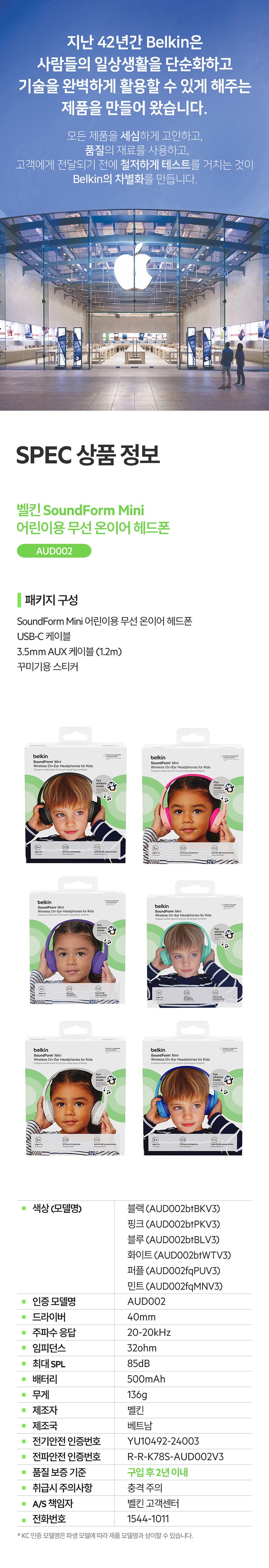 | 품명 및 모델명 | 벨킨 사운드폼 미니 어린이용 무선 온이어 C타입 충전 헤드폰 블랙 AUD002btBKV3 / AUD002 V3 (AUD002) | KC 인증정보 | 본품: R-R-K7S-AUD002V3, 유/KC마크 // 전지: YU10492-24003 / 스티커: CB061R6603-1001 |