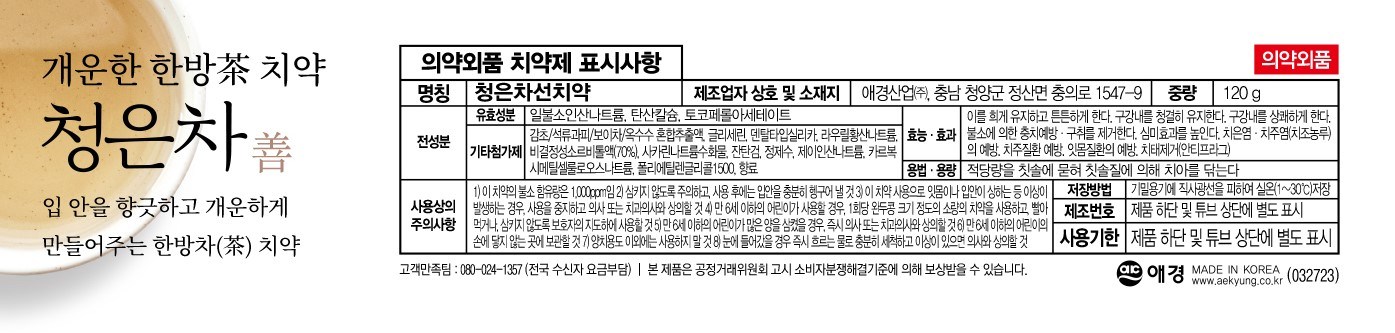 | 품명 및 모델명 | 청은차 선 치약 | 인증/허가 사항 | 의약외품 |