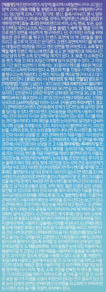 | 품명 및 모델명 | 깨끗한아이렌즈세정액(폴리헥사메틸렌비구아니드염산염액20%) | 인증/허가 사항 | 의약외품 |