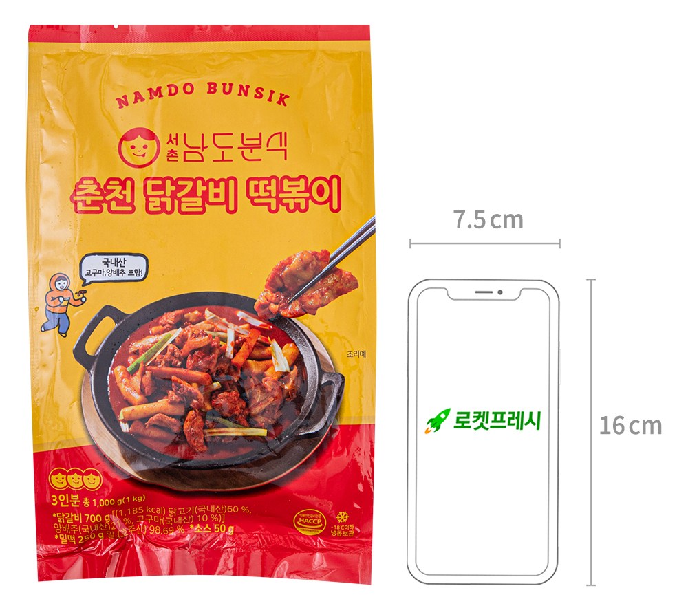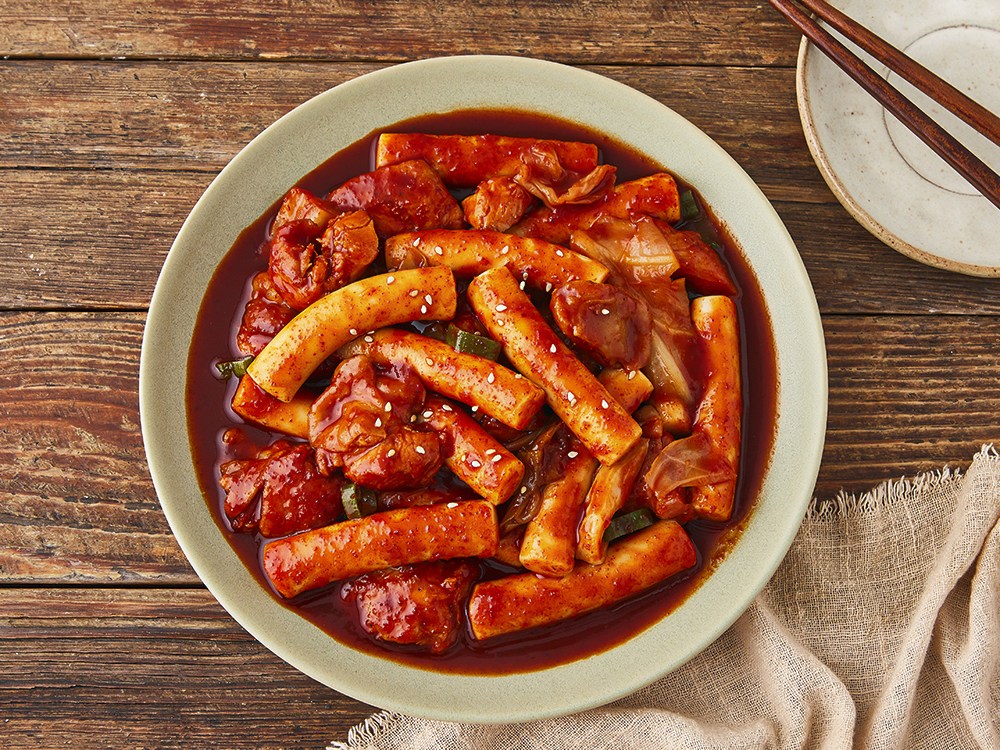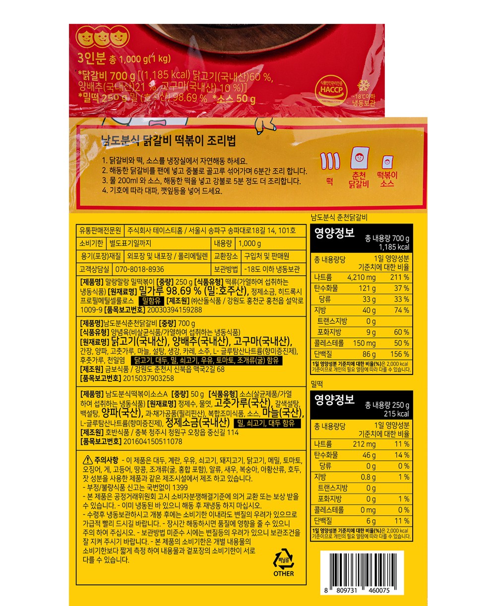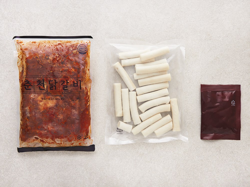 춘천 닭갈비, 떡, 떡볶이 소스로 구성되어 있습니다.
