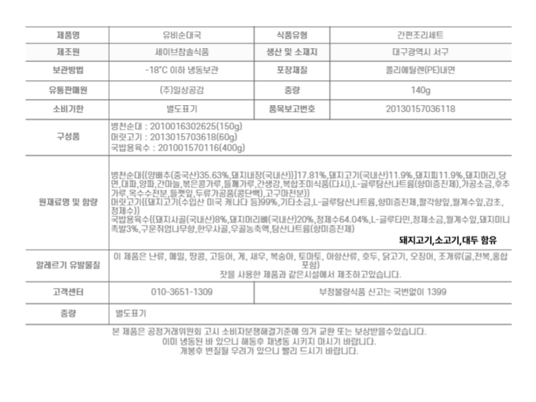 | 제품명 | 유비푸드 병천순대국 | 식품의 유형 | 가공식품 |