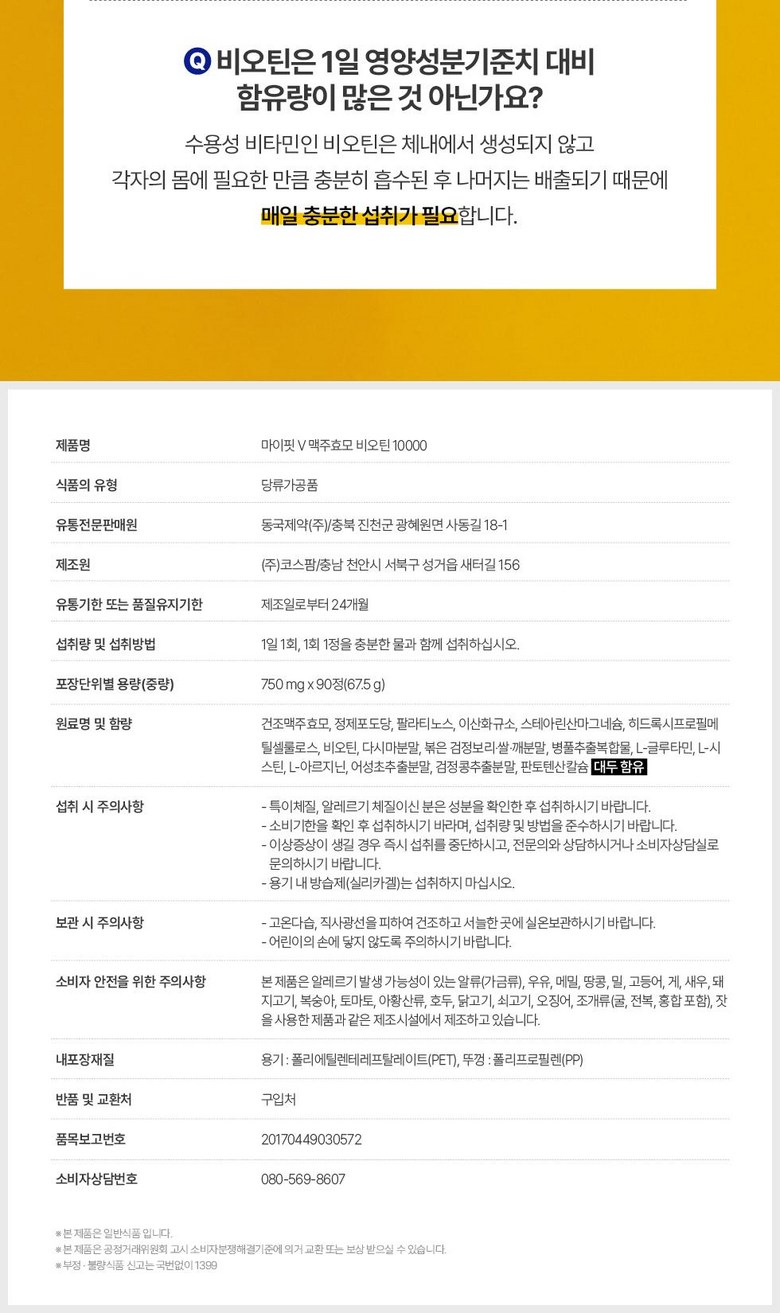 | 제품명 | 마이핏V 맥주효모 비오틴 10000 | 식품의 유형 | 당류가공품 |