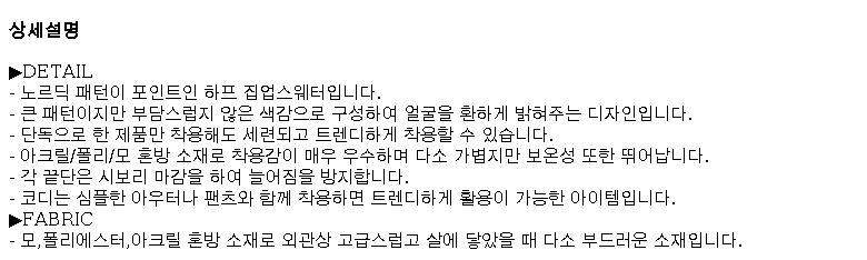 | 제품 소재 | 겉감: 아크릴 46% 폴리에스터 28% 모 26% 안감: 폴리에스터 100% | 색상 | 베이지 |