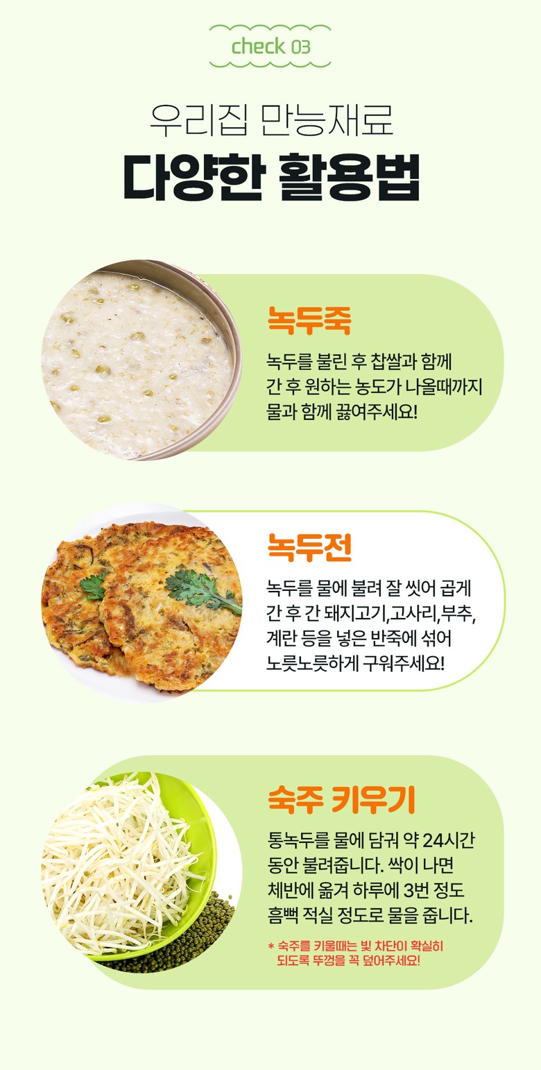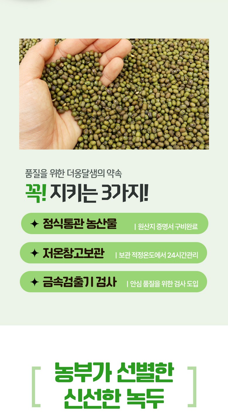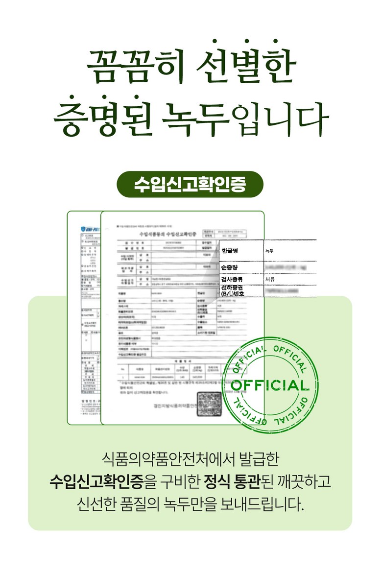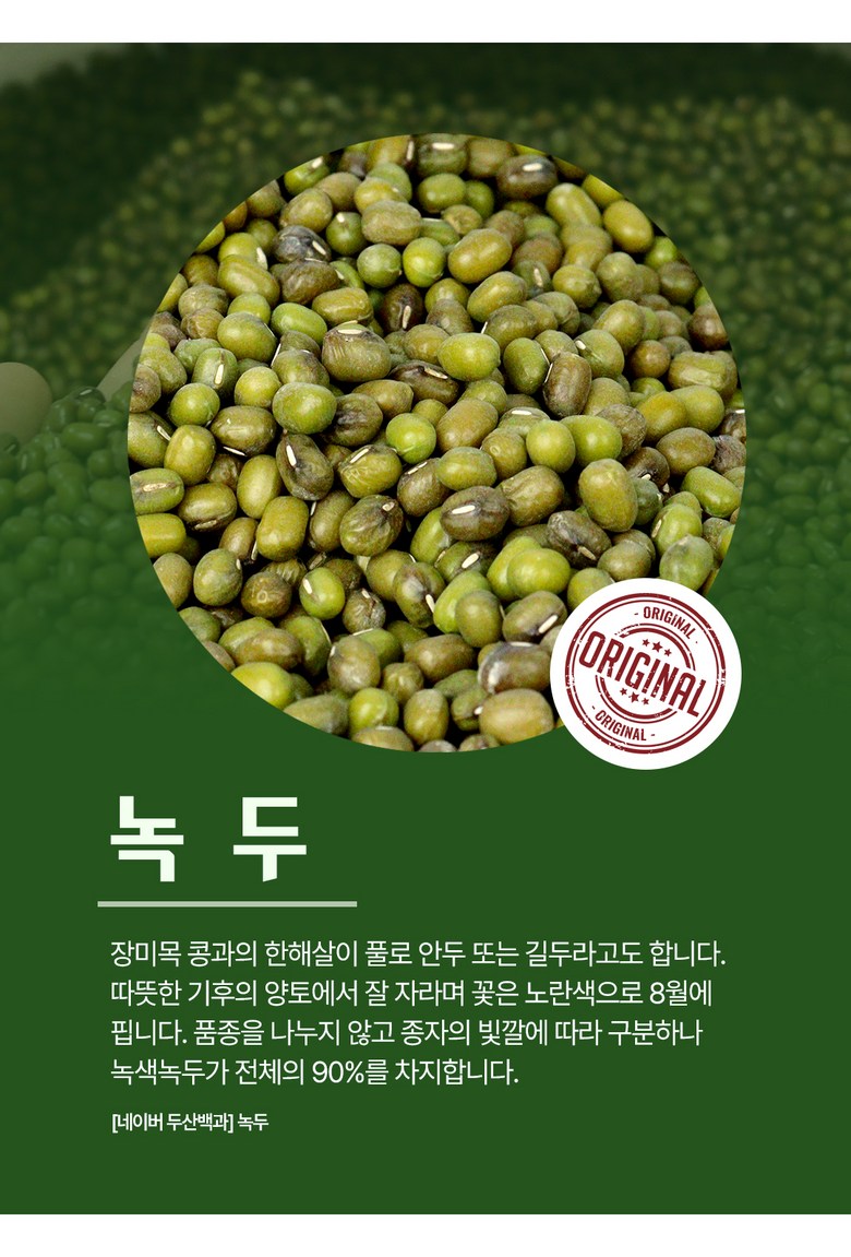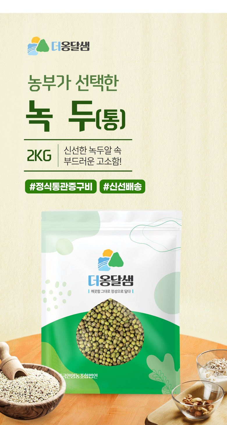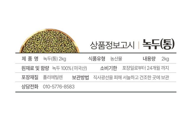| 품목 또는 명칭 | 녹두(통) 2kg | 포장단위별 내용물의 용량(중량),수량,크기 | 2kg,1봉 |