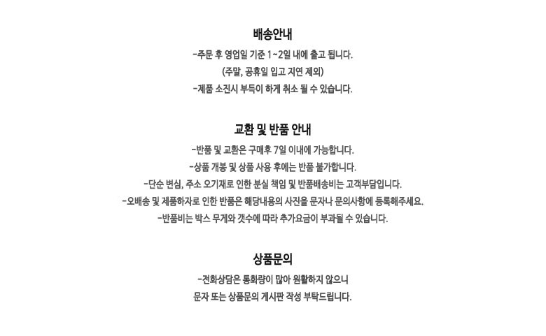 | 배송방법 | 순차배송 | 배송비 | 무료배송 - 도서산간 지역 배송불가 |