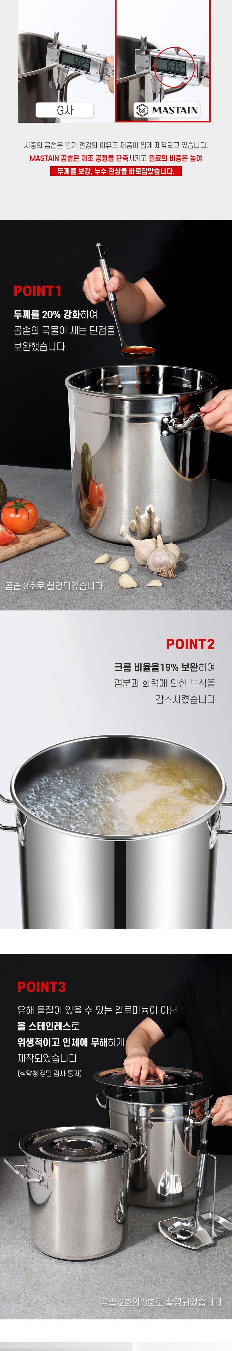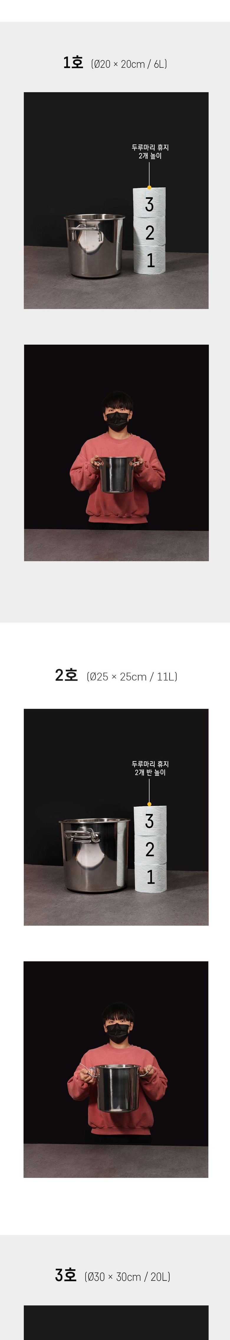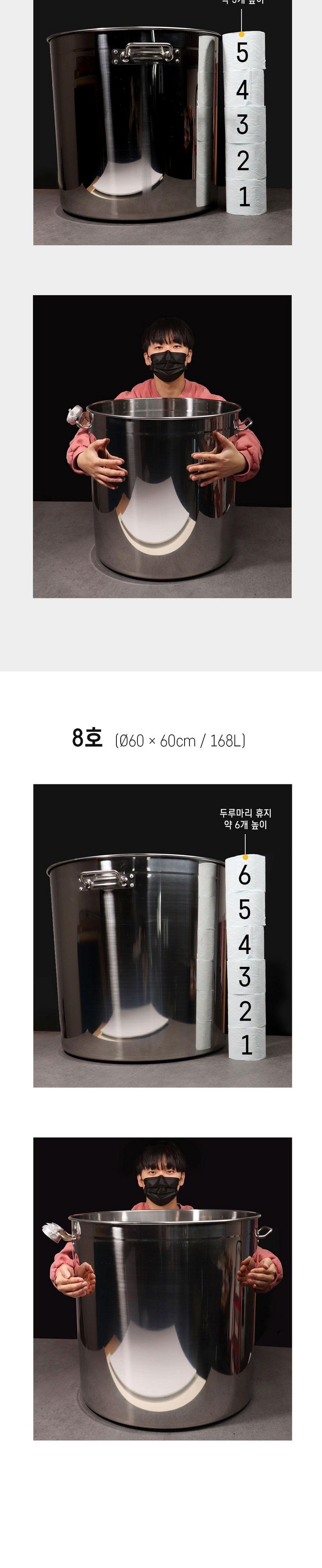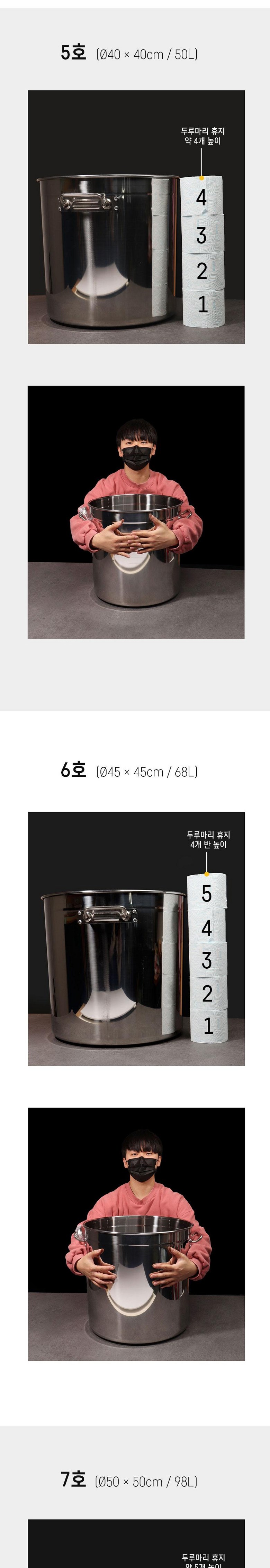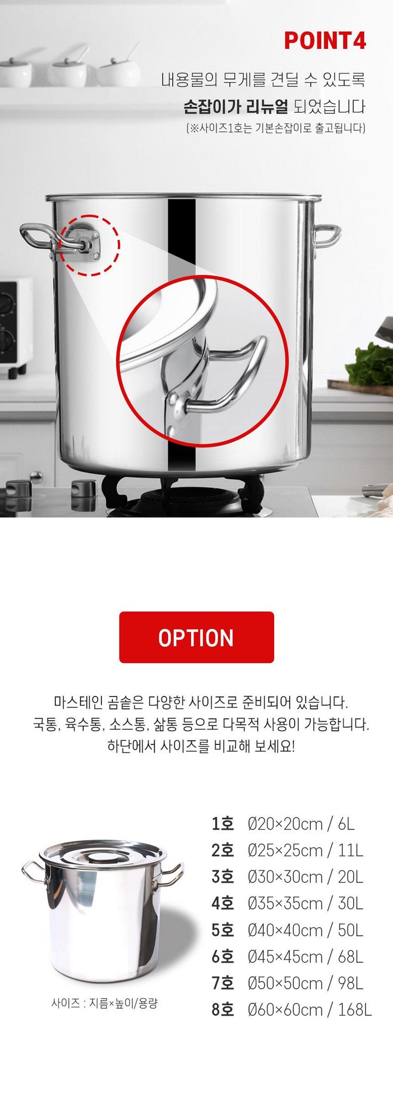 | 구성품 | 마스테인 강화 곰솥 냄비 (8size 택1) | 크기 | 1호 : 20cm (6L)2호 : 25cm (11L)3호 : 30cm (20L)4호 : 35cm (30L)5호 : 40cm (50L)6호 : 45cm (68L)7호 : 50cm (98L)8호 : 60cm (168L) |