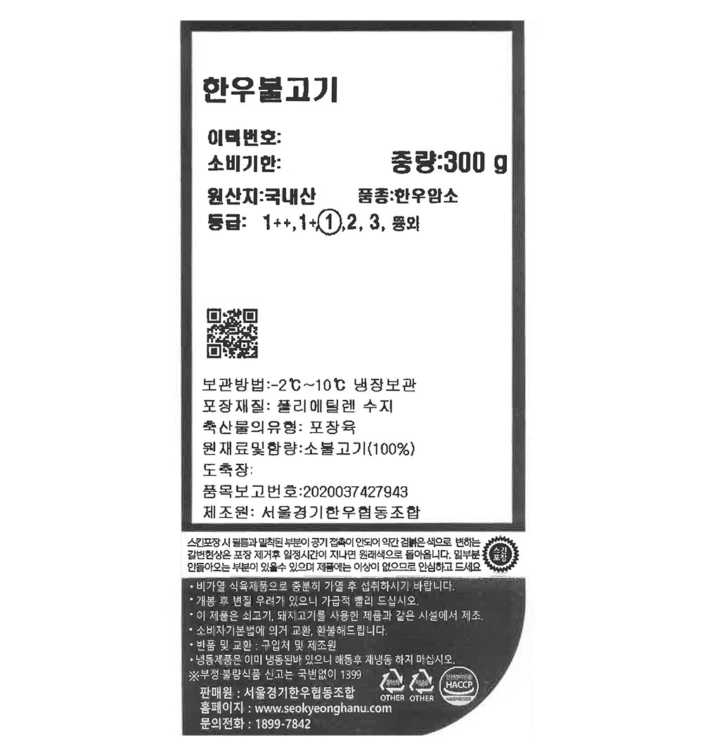 | 품목 또는 명칭 | 불고기 | 포장단위별 내용물의 용량(중량),수량,크기 | 300g x 6개 |