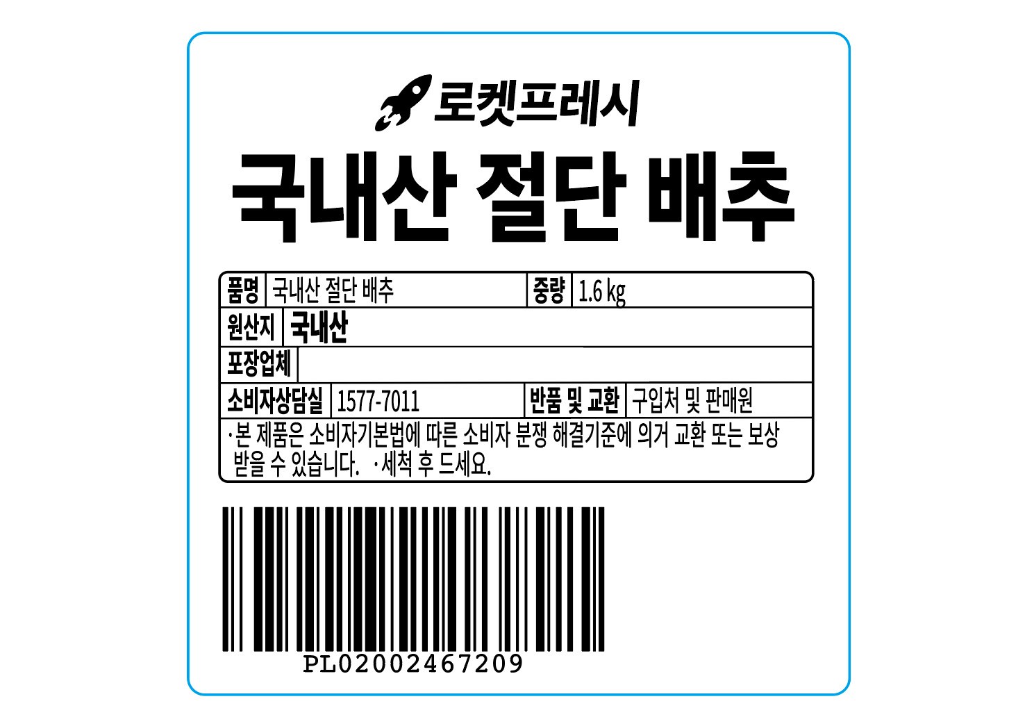 | 품목 또는 명칭 | 국내산 절단 배추 | 포장단위별 내용물의 용량(중량),수량,크기 | 1봉 (1.6kg) |
