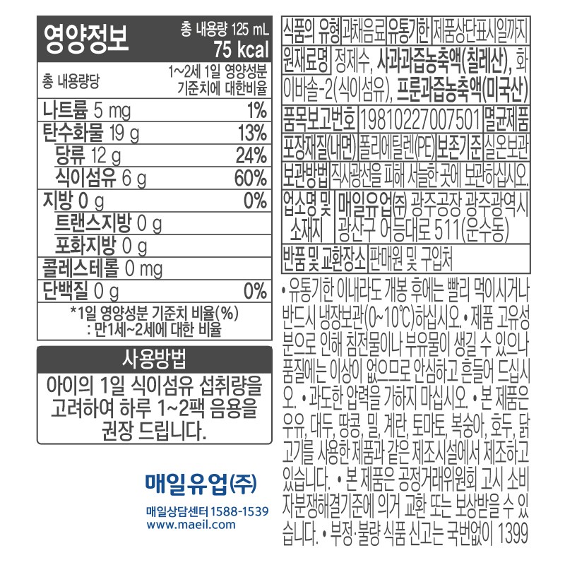 | 제품명 | 요미요미 튼튼 프룬사과 | 식품의 유형 | 과채음료 |
