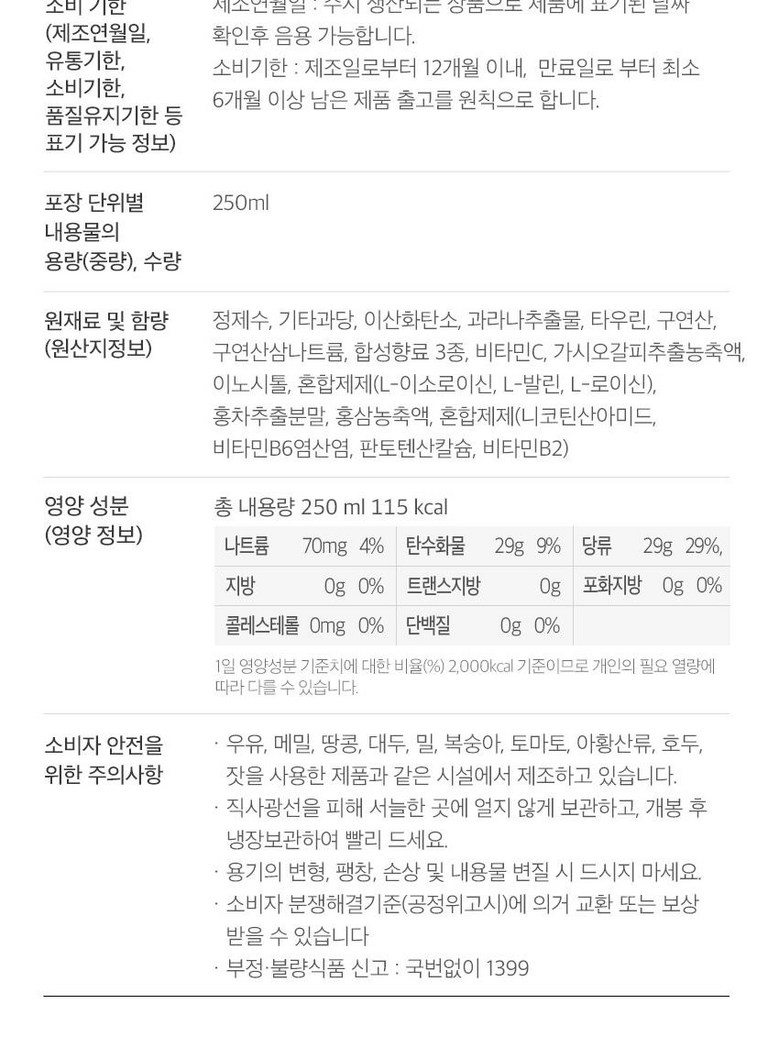 | 생산자 및 소재지 | 상품 상세페이지 참조 | 제조연월일, 소비기한 또는 품질유지기한 | 상품 상세페이지 참조 |