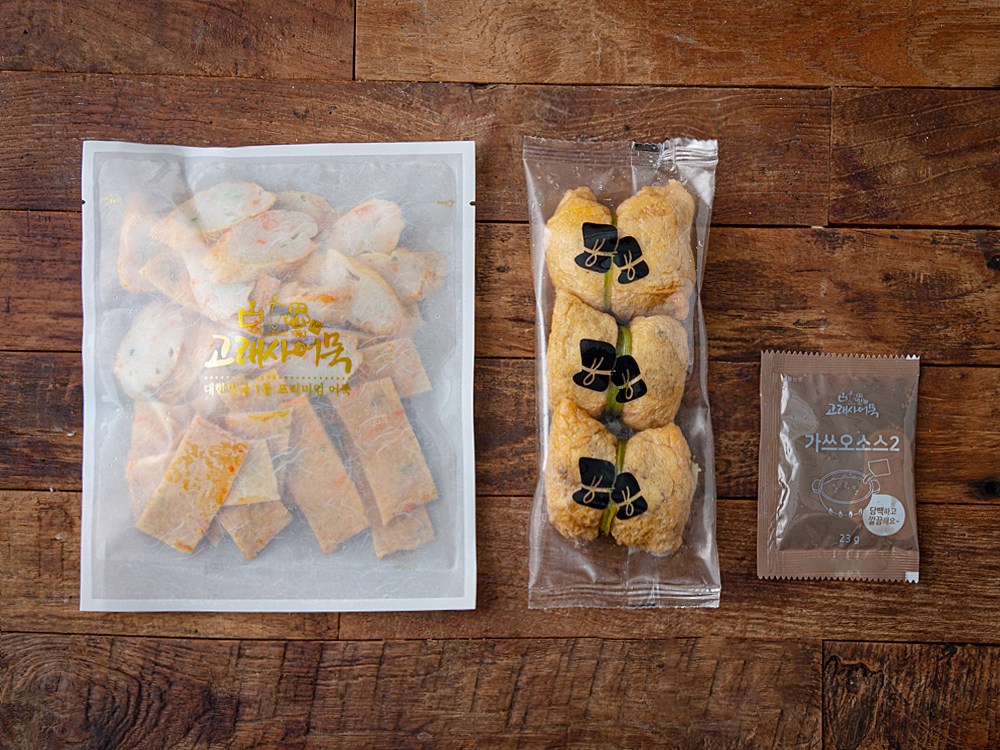 2가지 모양의 슬라이스 어묵, 유부주머니, 소스로 구성되어 있습니다.