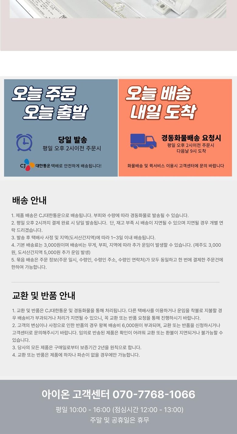 - ㆍ모니터 해상도의 차이로 인해 색상이나 이미지가 실제와 달라, 고객이 단순 변심으로 교환/반품을 무료로 요청하는 경우