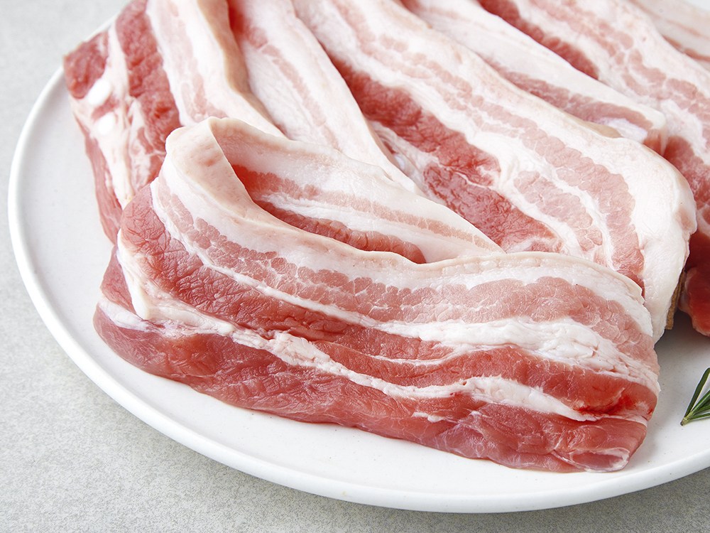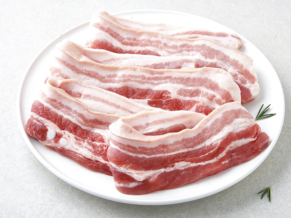 쫀득한 식감과 고소한 맛이 좋은 미박삼겹살이에요. 껍질이 그대로 붙어 있어 삼겹살 특유의 촉촉한 육즙이 살아있는 점이 매력적이죠. 신선한 상태 그대로 구워 먹는 것이 가장 맛있답니다.