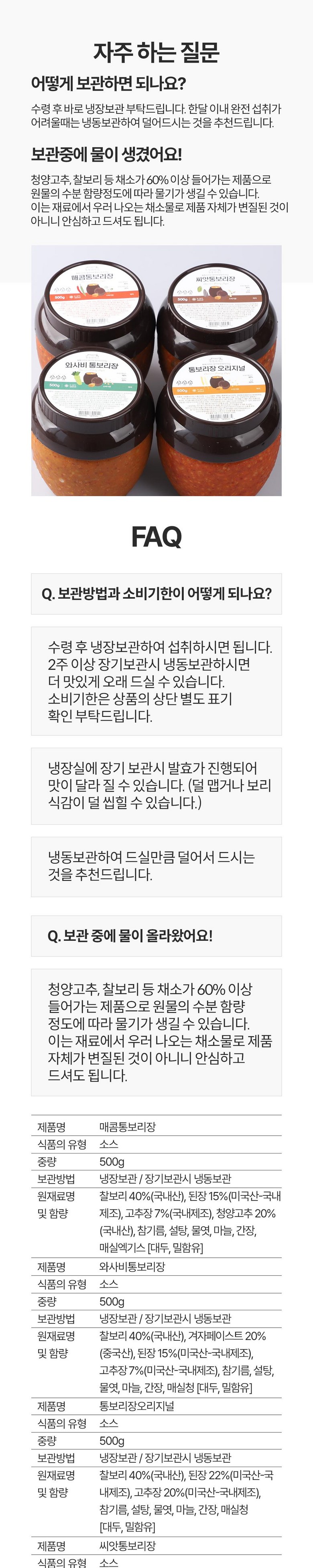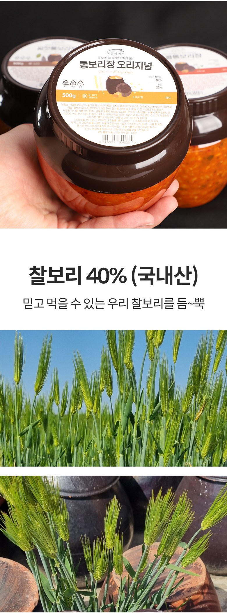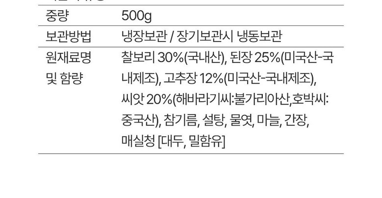 | 포장단위별 내용물의 용량(중량), 수량 | 500g 단위 | 원재료명 및 함량 | 매콤 : 찰보리 40%(국내산), 된장 15%(미국산-국내생산), 고추장 7%(미국산-국내생산), 청양고추20%(국내산), 참기름, 설탕, 물엿, 마늘, 간장, 매실엑기스와사비 : 찰보리 40%(국내산), 겨자페이스트 20%(중국산), 된장 15%(미국산-국내생산), 고추장 7%(미국산-국내생산), 참기름, 설탕, 물엿, 마늘, 간장, 매실청오리지널 : 찰보리 40%(국내산), 된장 22%(미국산-국내생산), 고추장 20%(미국산-국내생산), 참기름, 설탕, 물엿, 마늘, 간장, 매실청씨앗 : 찰보리 30%(국내산), 된장 25%(미국산-국내생산), 고추장 12%(미국산-국내생산),씨앗 20%(해바라기씨:불가리아산,호박씨:중국산), 참기름, 설탕, 물엿, 마늘, 간장, 매실청[대두, 밀함유] |