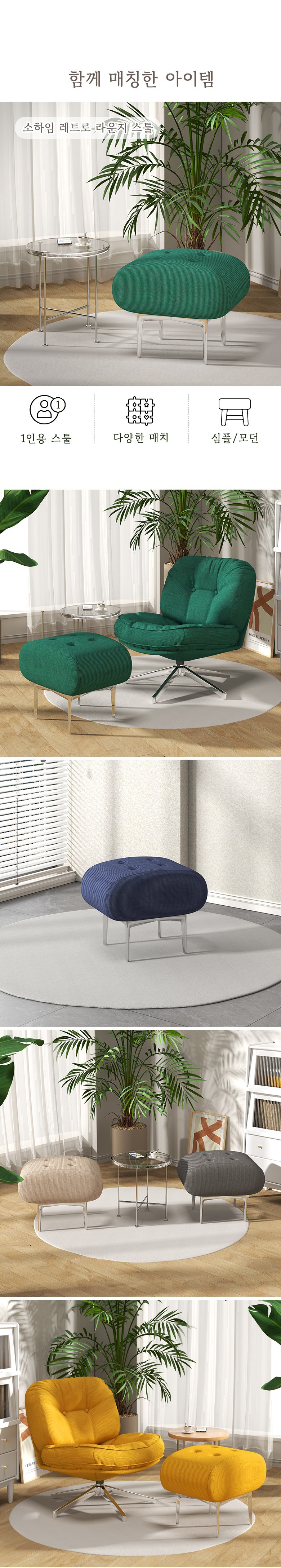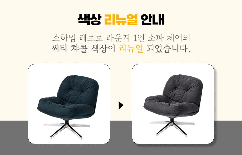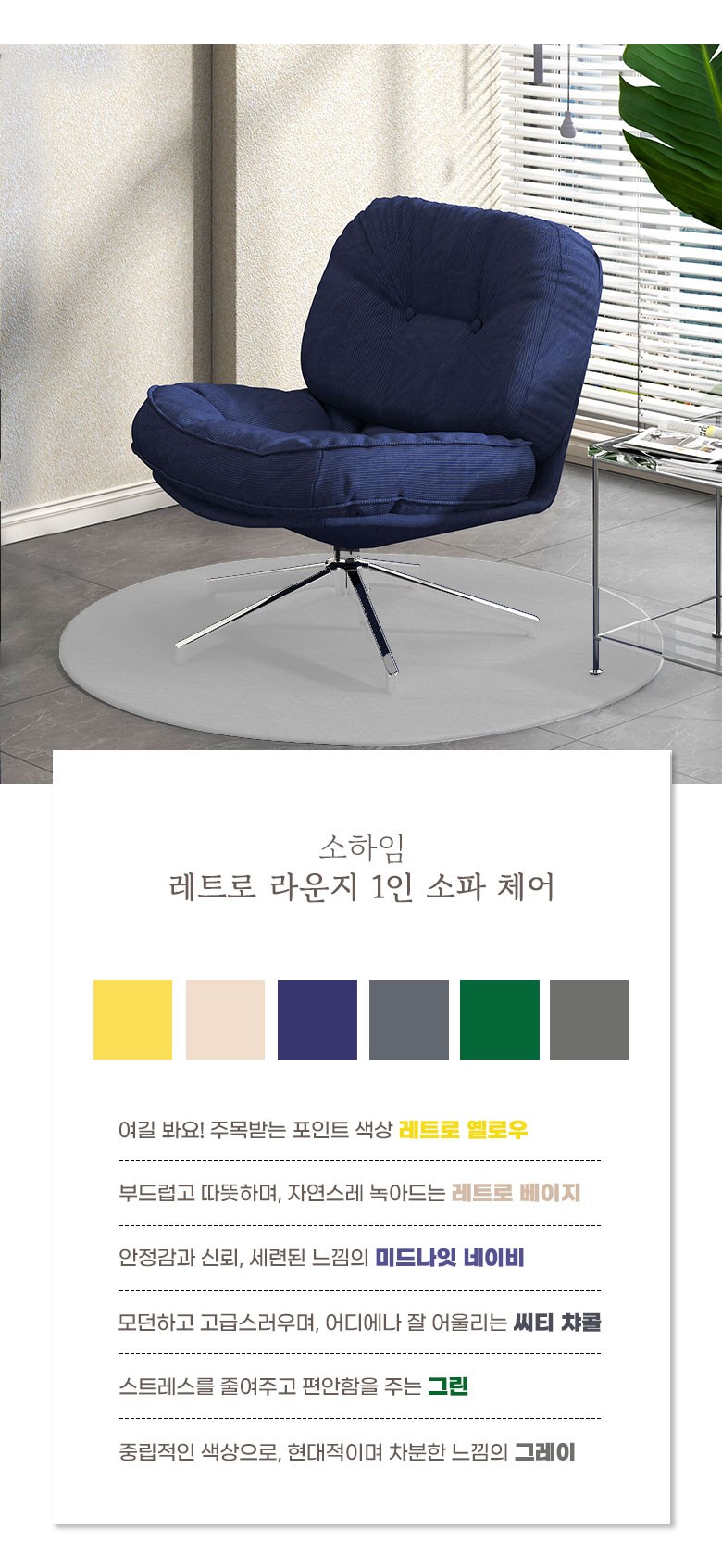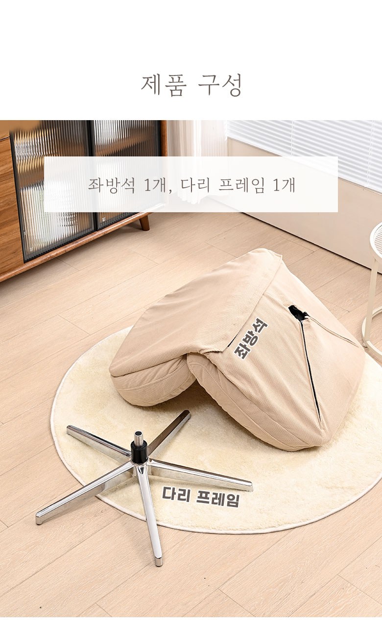| 색상 | 레트로 베이지(B), 레트로 옐로우(Y), 미드나잇 네이비(N), 씨티 챠콜(C), 그레이(G), 그린(GN) | 구성품 | 좌방석 1개, 다리 프레임 1개 |