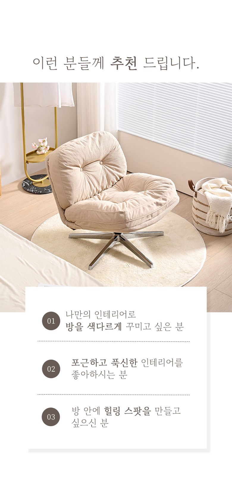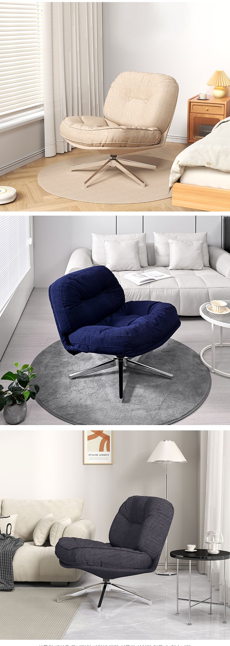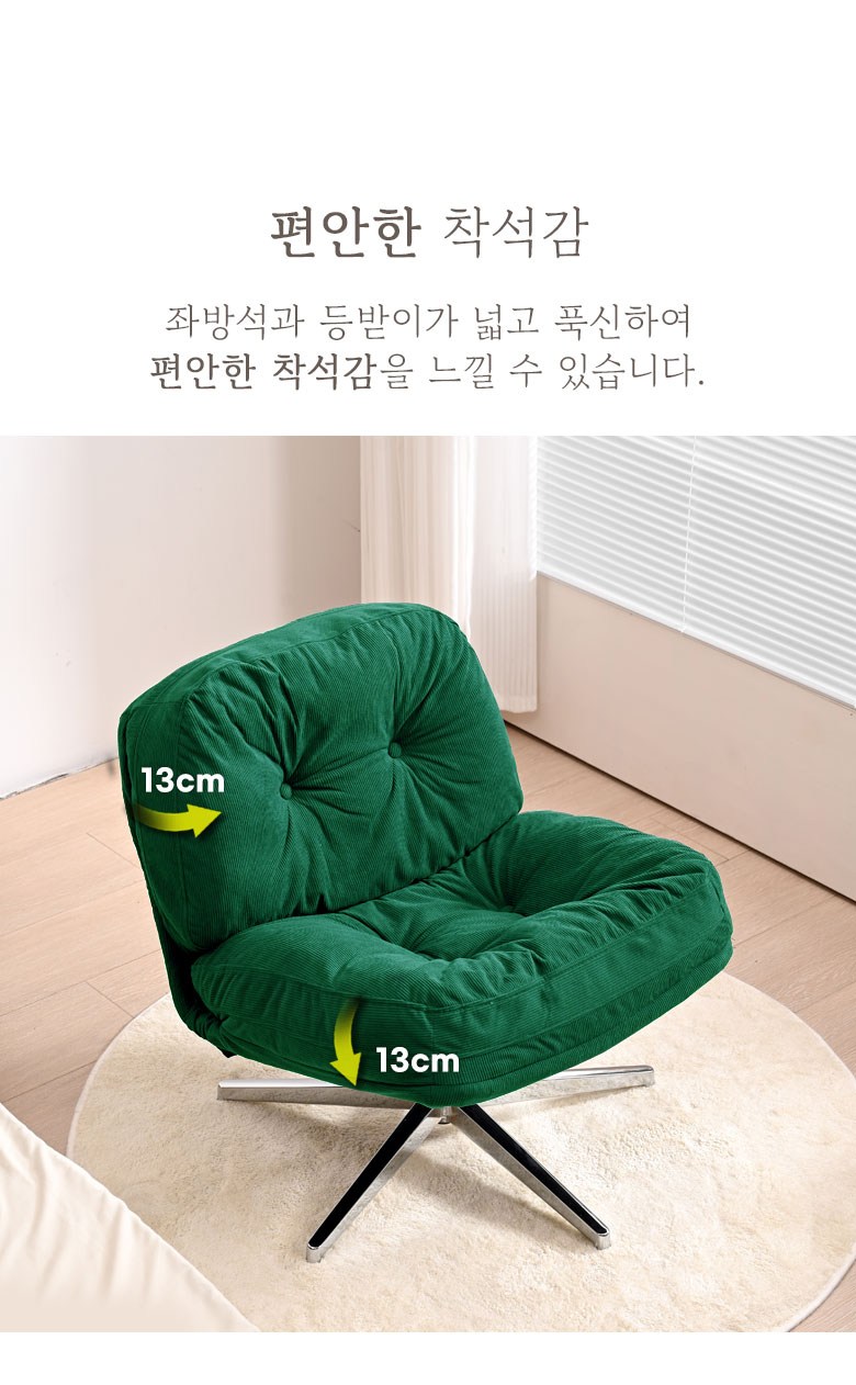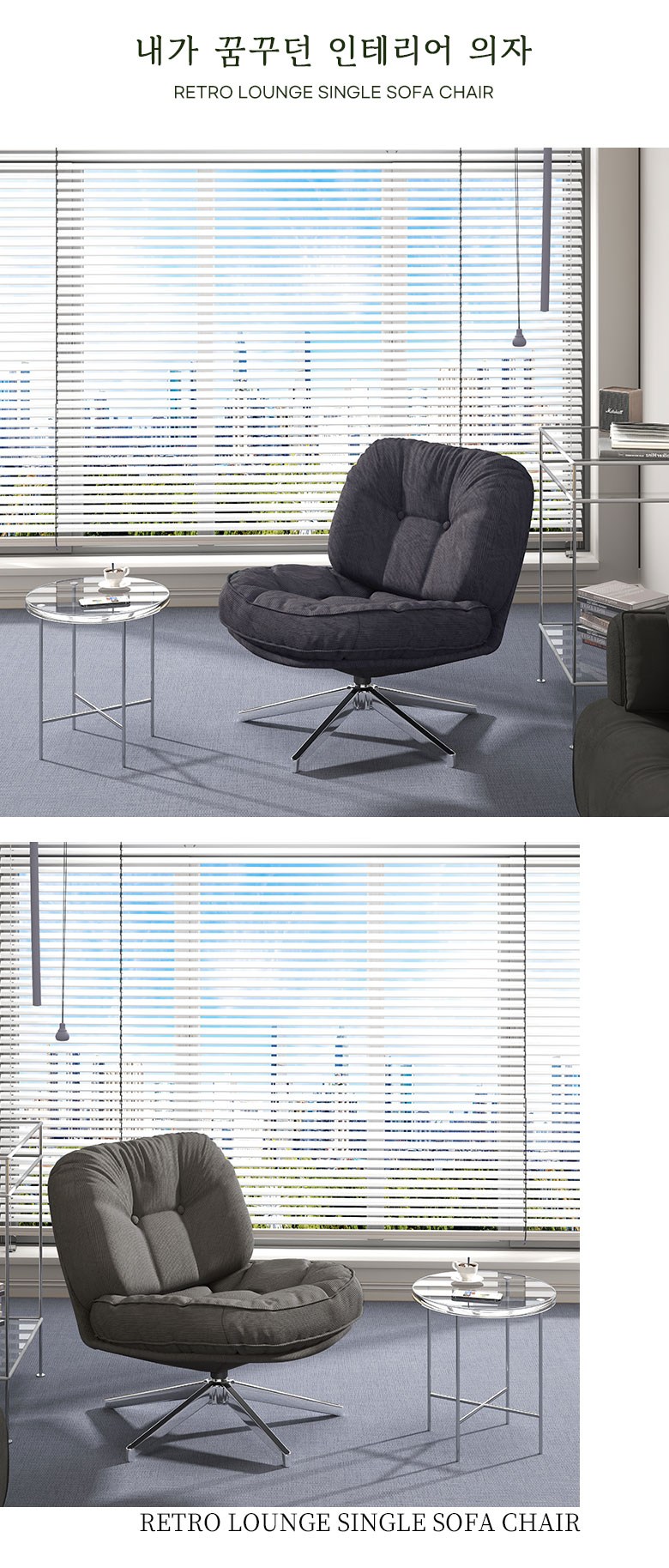 | 색상 | 레트로 베이지(B), 레트로 옐로우(Y), 미드나잇 네이비(N), 씨티 챠콜(C), 그레이(G), 그린(GN) | 구성품 | 좌방석 1개, 다리 프레임 1개 |