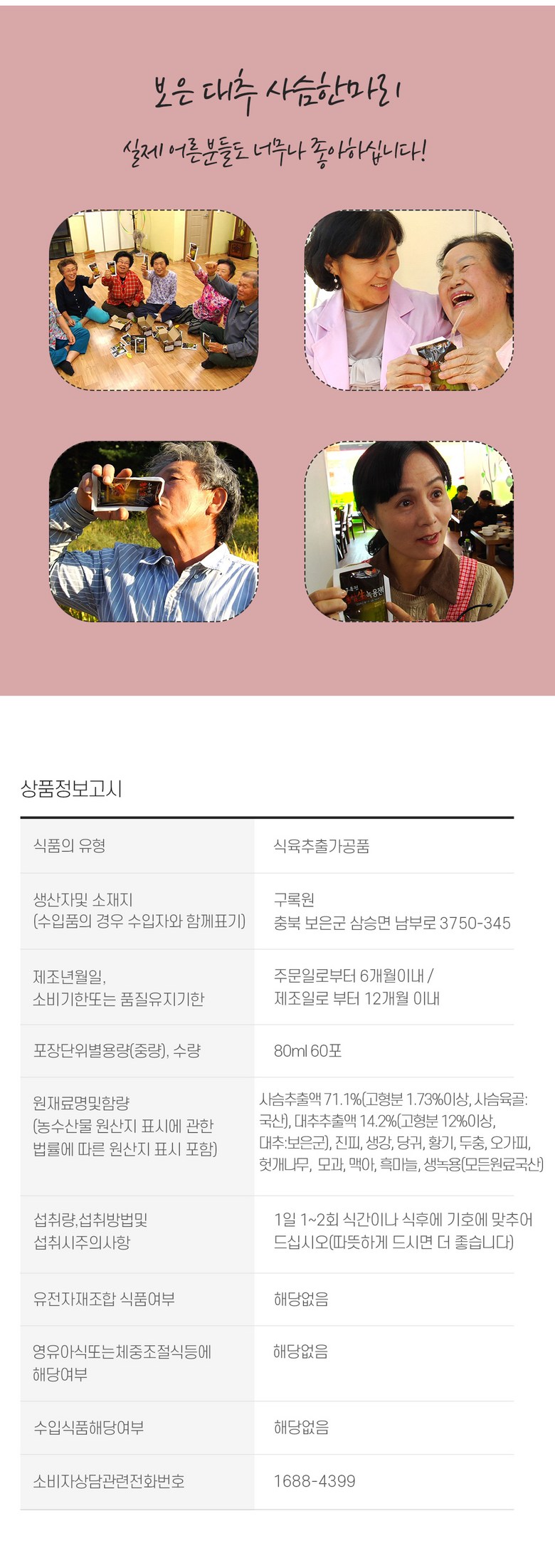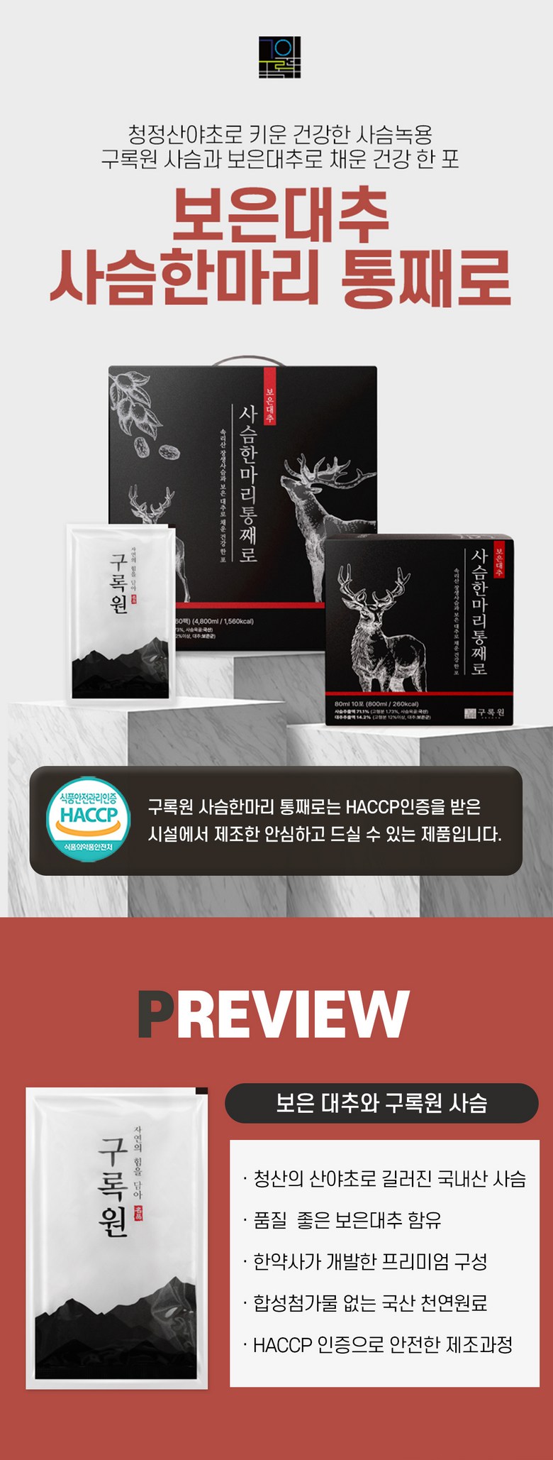 | 제품명 | 구록원 보은대추 사슴한마리통째로 | 식품의 유형 | 상세페이지내 기재 |