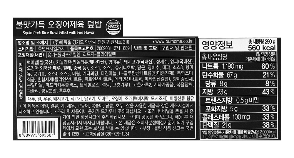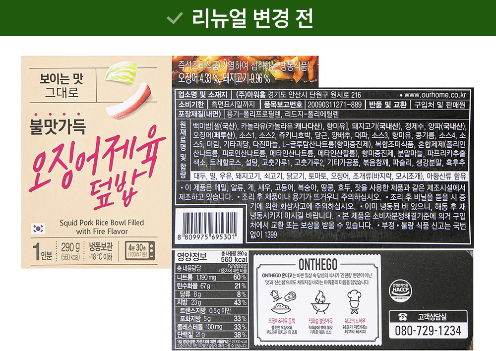 | 제품명 | 불맛가득 오징어제육 덮밥 | 식품의 유형 | 즉석조리식품 |
