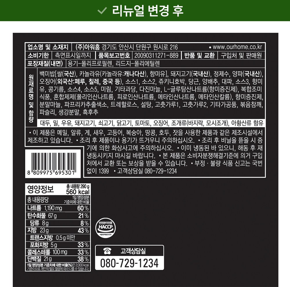 | 포장단위별 내용물의 용량(중량), 수량 | 290g x 2개 | 원재료명 및 함량 | 컨텐츠 참조 |