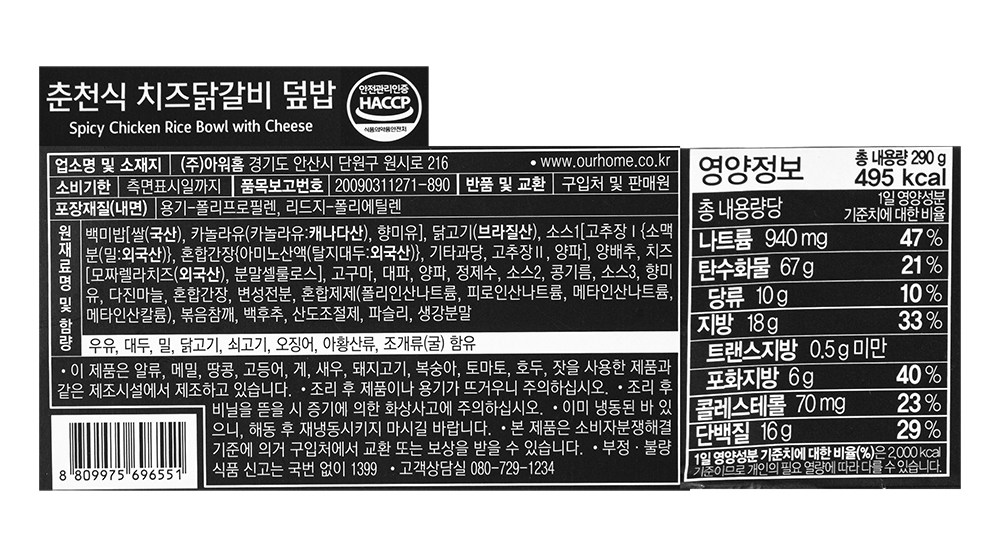 | 제품명 | 춘천식 치즈닭갈비 덮밥 | 식품의 유형 | 즉석조리식품 |