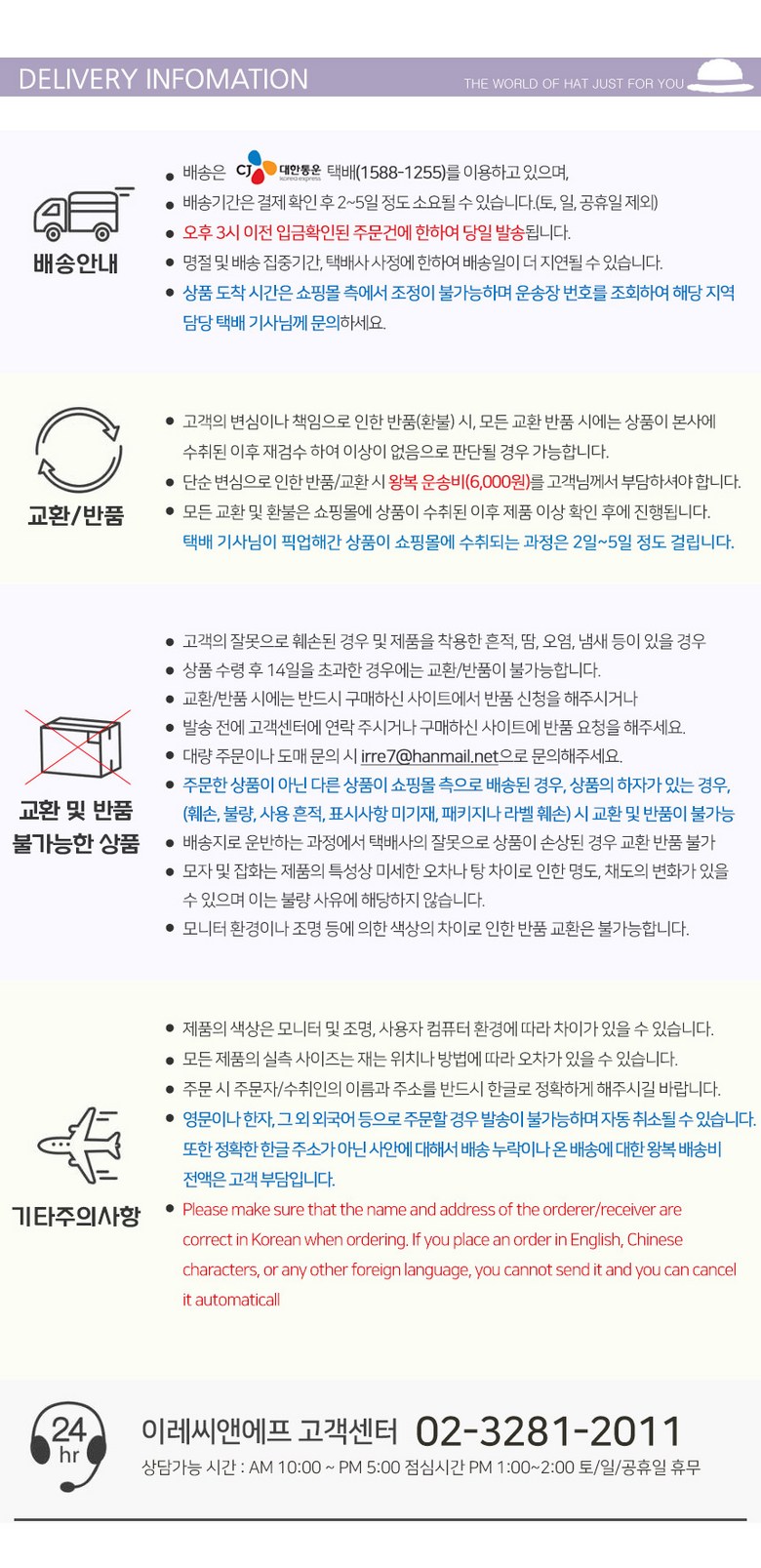 - ㆍ모니터 해상도의 차이로 인해 색상이나 이미지가 실제와 달라, 고객이 단순 변심으로 교환/반품을 무료로 요청하는 경우