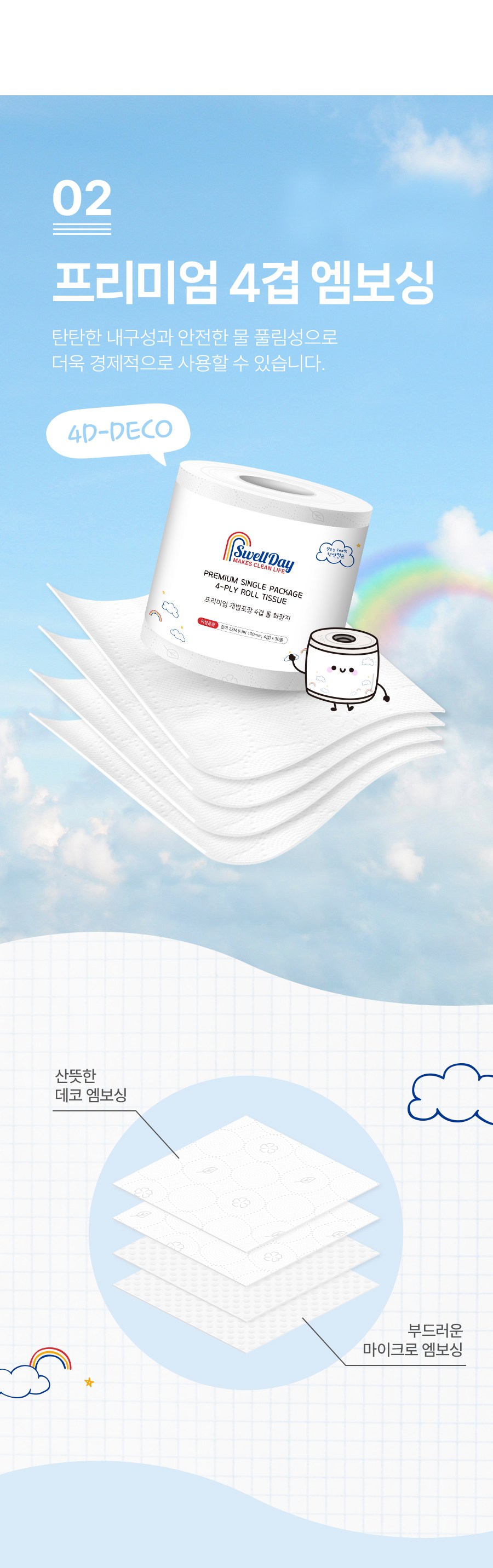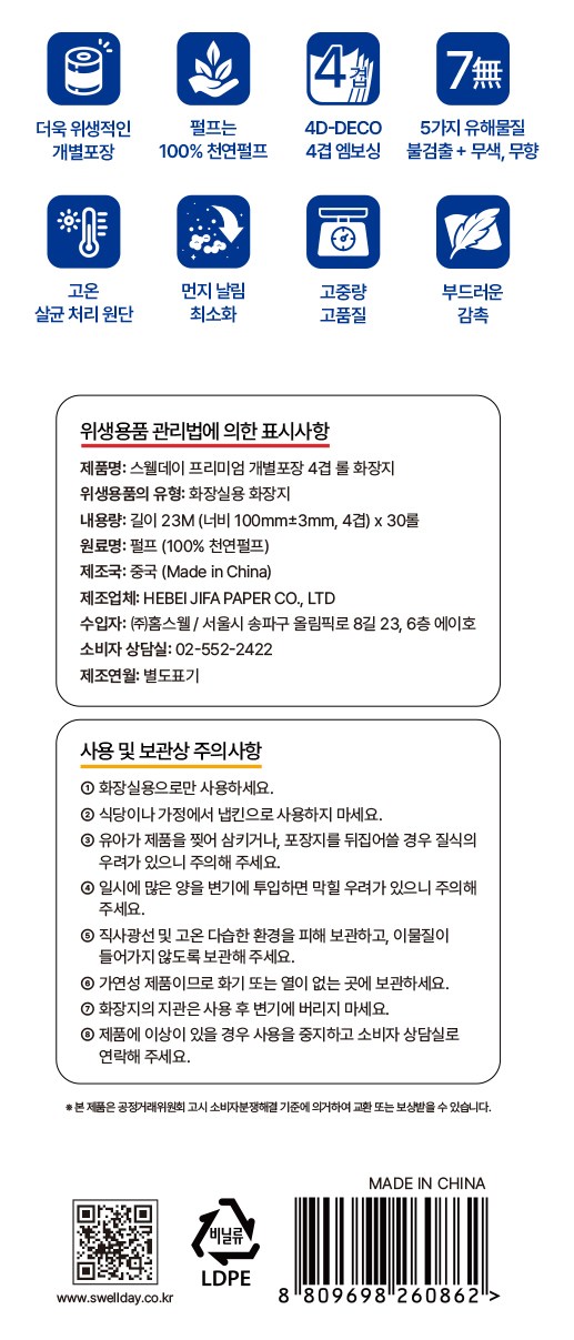 | 품명 및 모델명 | 스웰데이 프리미엄 개별포장 4겹 롤 화장지 | 인증/허가 사항 | 위생용품 |