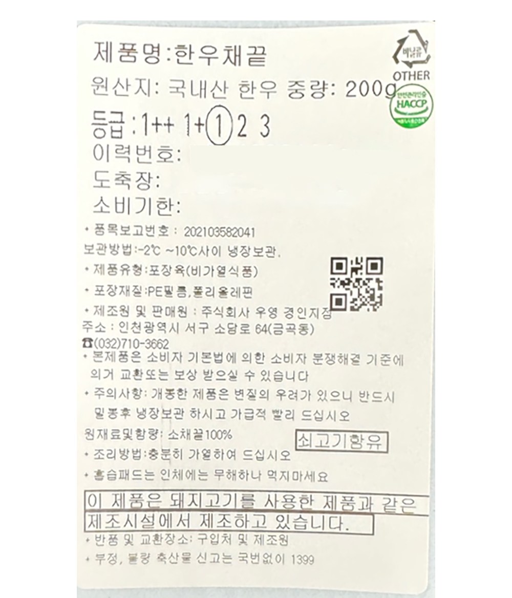 | 소비기한 또는 품질유지기한 | 소비기한(또는 유통기한) : 2026년 03월 12일 이거나 그 이후인 상품 | 세부 품목군별 표시사항 | 축산물 등급표시 : 1등급 / 이력번호 표시유무 : 이력번호 표시제품임 |