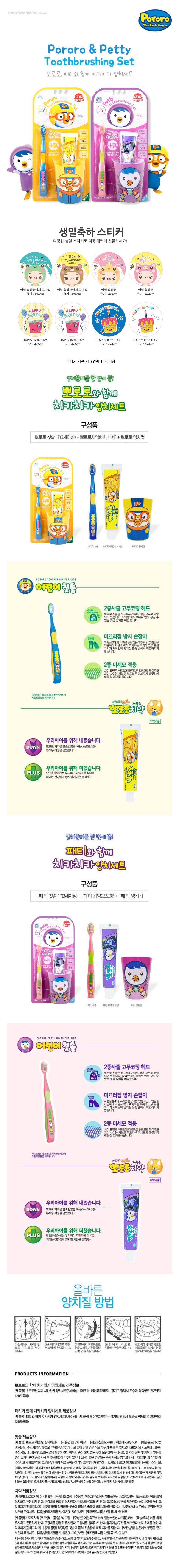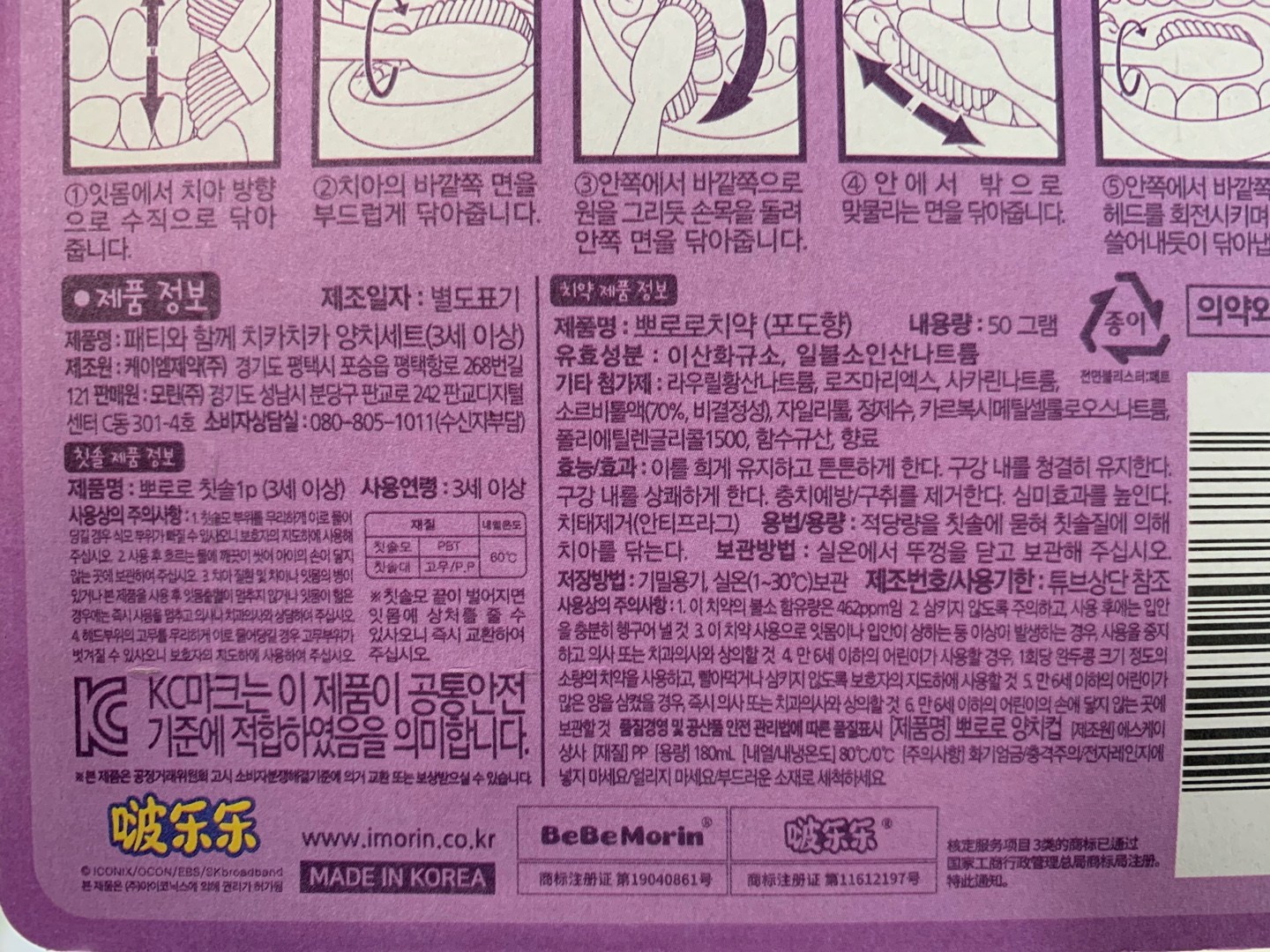 | 품명 및 모델명 | 뽀로로 치카치카 양치세트 뽀로로 + 패티 + 스티커 세트 | KC 인증정보 | 칫솔 : 유/KC마크, 양치컵, 치약 , 스티커: 해당없음 |