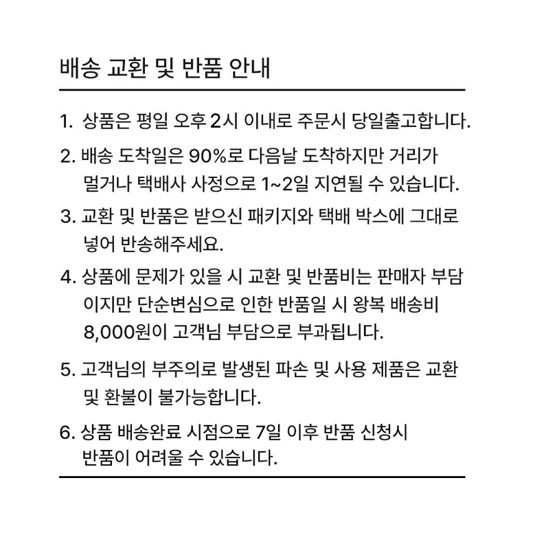 | 교환/반품 비용 (왕복비용) | 8,000원 - 단, 고객 변심의 경우에만 발생 - 도서산간 및 일부 지역 추가비용 발생 |