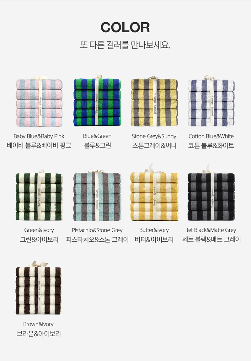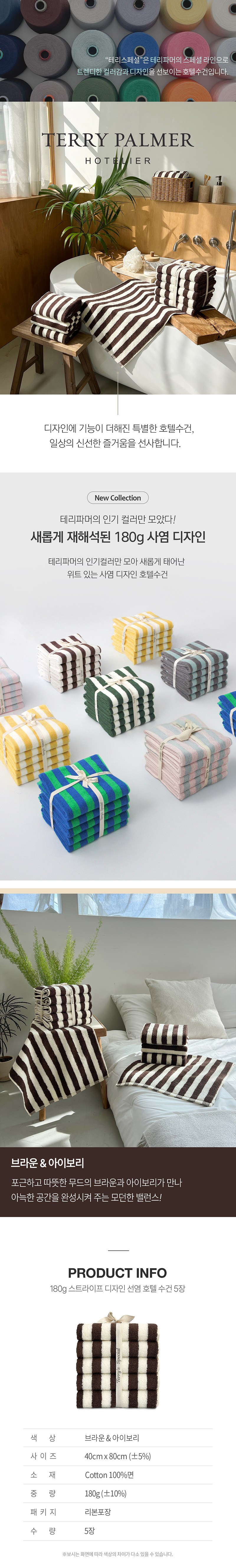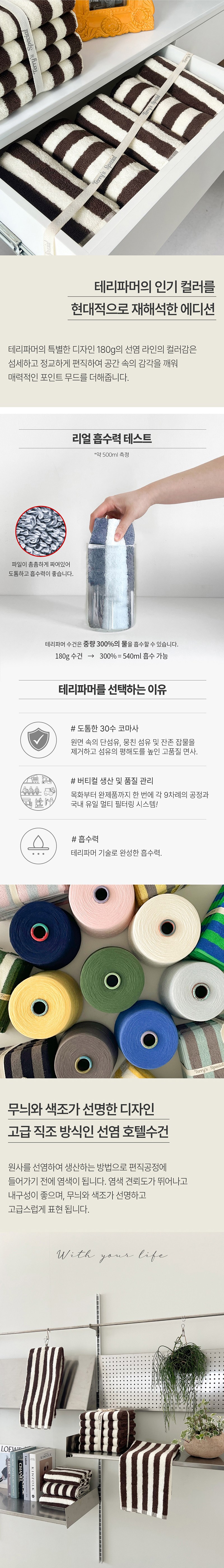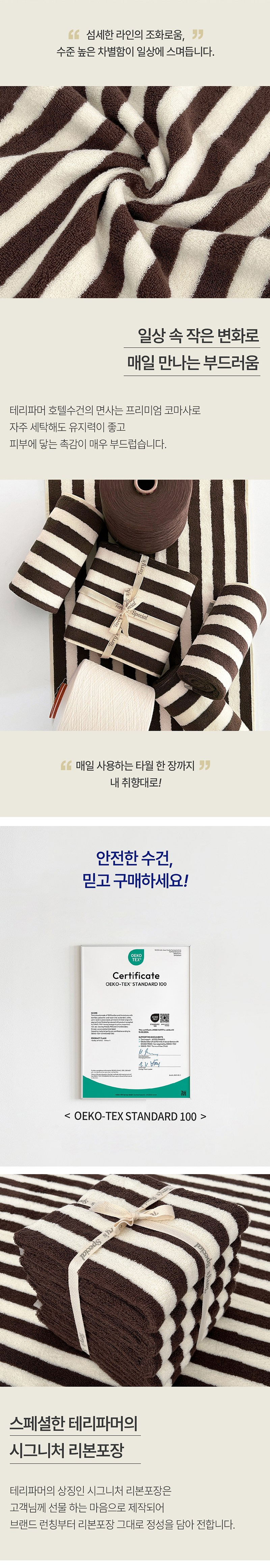 | 품명 및 모델명 | 테리파머 스트라이프 디자인 선염 수건 | 인증/허가 사항 | 해당없음 |