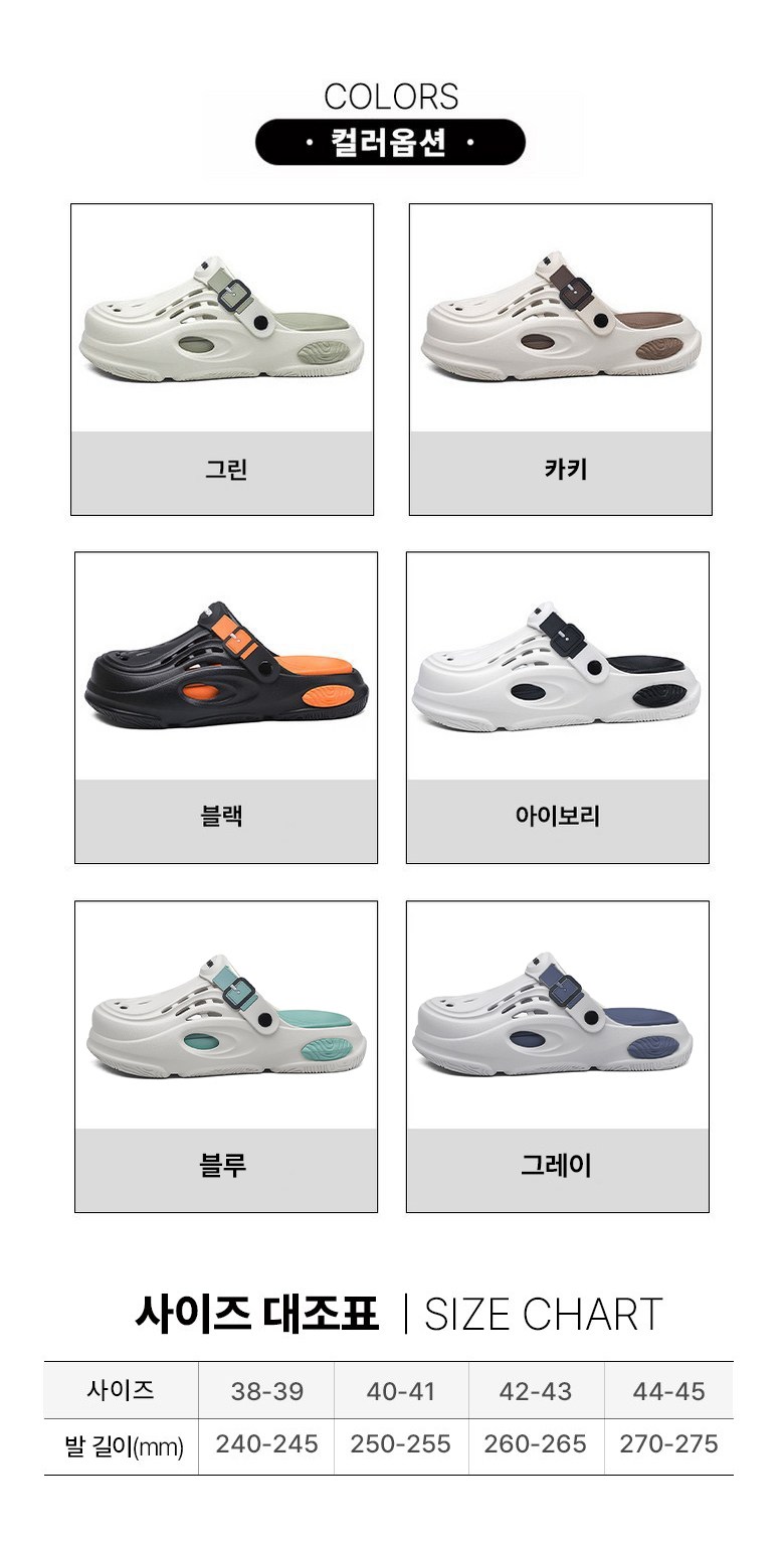 | 제품의 주소재(운동화인 경우에는 겉감,안감을 구분하여 표시) | EVA소재 | 색상 | 그레이,그린,블랙,블루,아이보리,카키 |