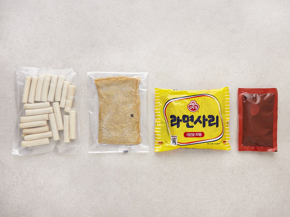 떡, 어묵, 라면사리, 소스로 구성되어 있습니다.