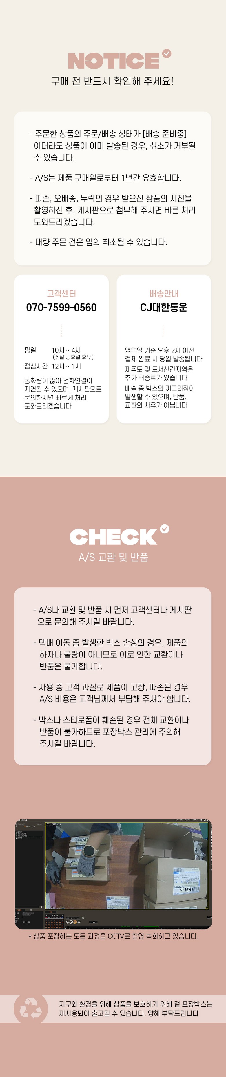 - ㆍ모니터 해상도의 차이로 인해 색상이나 이미지가 실제와 달라, 고객이 단순 변심으로 교환/반품을 무료로 요청하는 경우