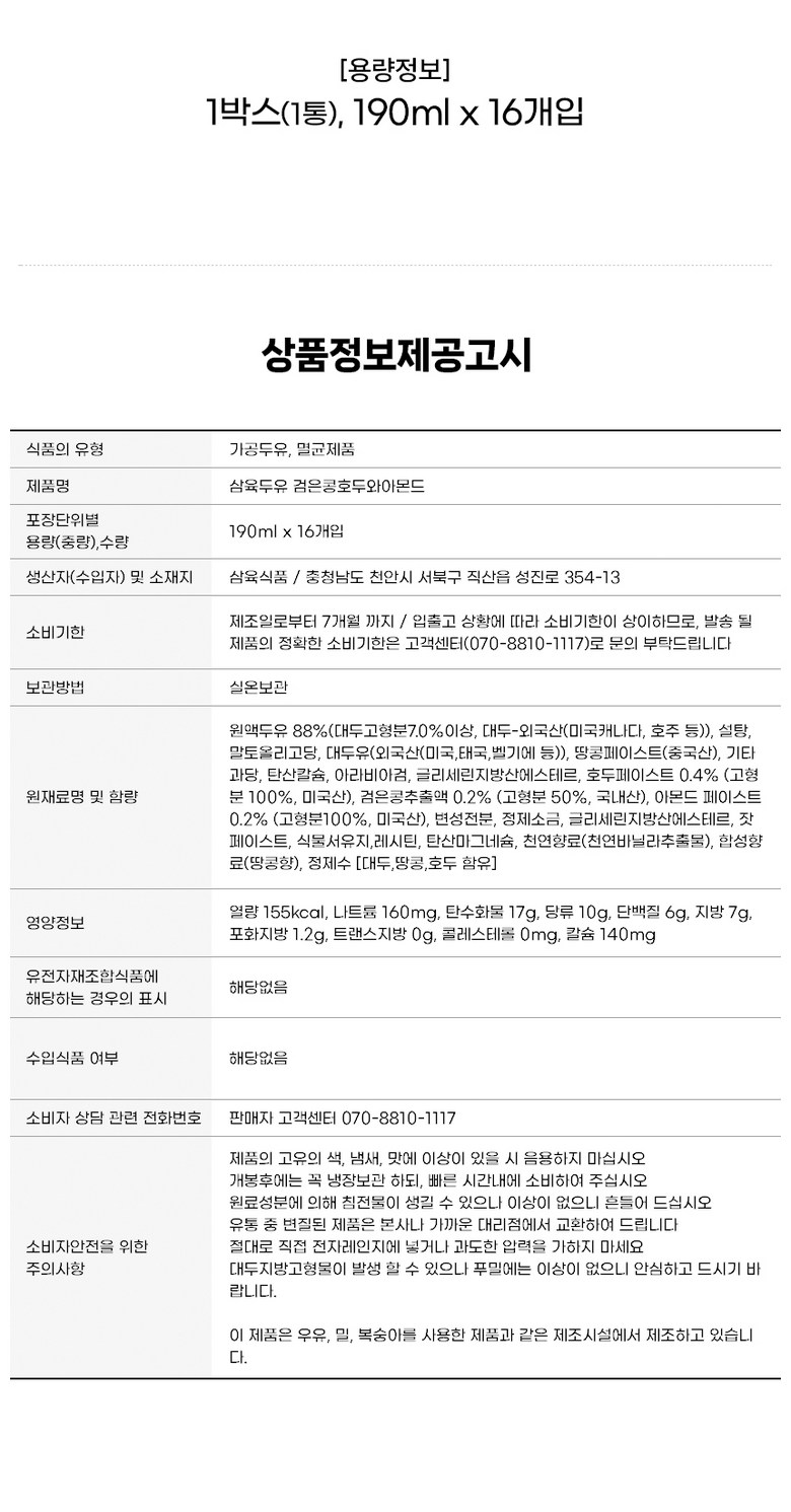 | 포장단위별 내용물의 용량(중량), 수량 | 190ml x 16개입 | 원재료명 및 함량 | 원액두유 88%(대두고형분7.0%이상, 대두-외국산(미국캐나다, 호주 등)), 설탕, 말토올리고당, 대두유(외국산(미국,태국,벨기에 등)), 땅콩페이스트(중국산), 기타과당, 탄산칼슘, 아라비아검, 글리세린지방산에스테르, 호두페이스트 0.4% (고형분 100%, 미국산), 검은콩추출액 0.2% (고형분 50%, 국내산), 아몬드 페이스트 0.2% (고형분100%, 미국산), 변성전분, 정제소금, 글리세린지방산에스테르, 잣페이스트, 식물서유지,레시틴, 탄산마그네슘, 천연향료(천연바닐라추출물), 합성향료(땅콩향), 정제수 [대두,땅콩,호두 함유] |