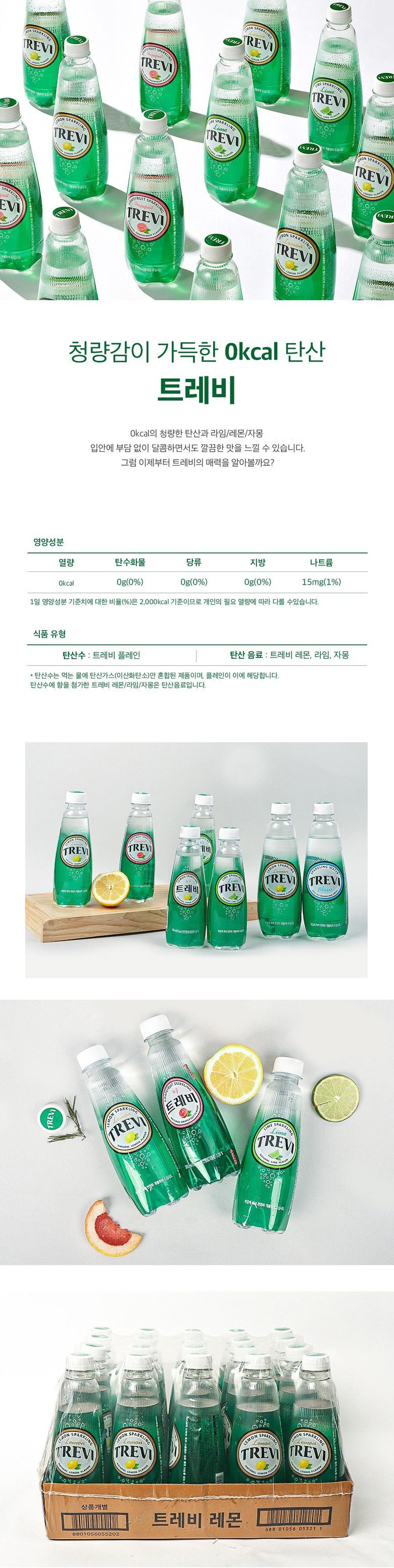| 포장단위별 내용물의 용량(중량), 수량 | 트레비 플레인 300ml*20개,1개 / 트레비 자몽 300ml*20개,1개 / 트레비 레몬 300ml*20개,1개/ 트레비 라임 300ml*20개,1개 | 원재료명 및 함량 | 컨텐츠 참조 |