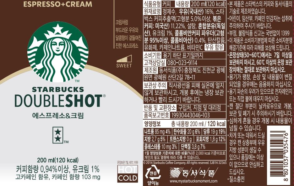 | 제품명 | 스타벅스 더블샷 에스프레소&크림 | 식품의 유형 | 유음료 |