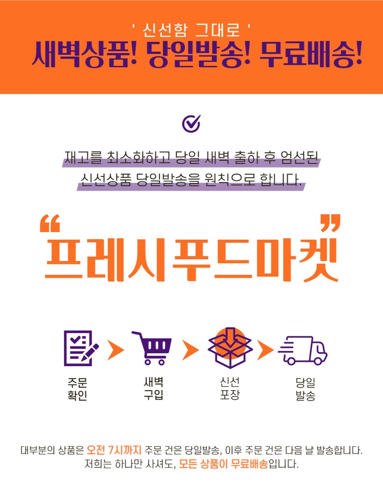 | 배송방법 | 신선/냉장/냉동 | 배송비 | 무료배송 · 도서산간 추가 배송비 - 제주 지역: 3,000원 - 도서산간 지역: 6,000원 |